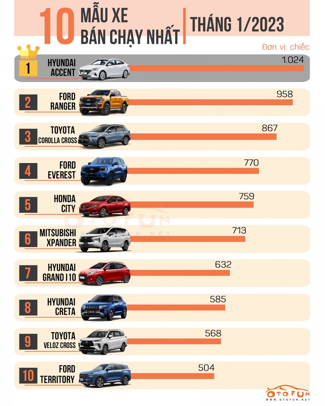 [Infographic] 10 xe bán chạy nhất tháng 1/2023