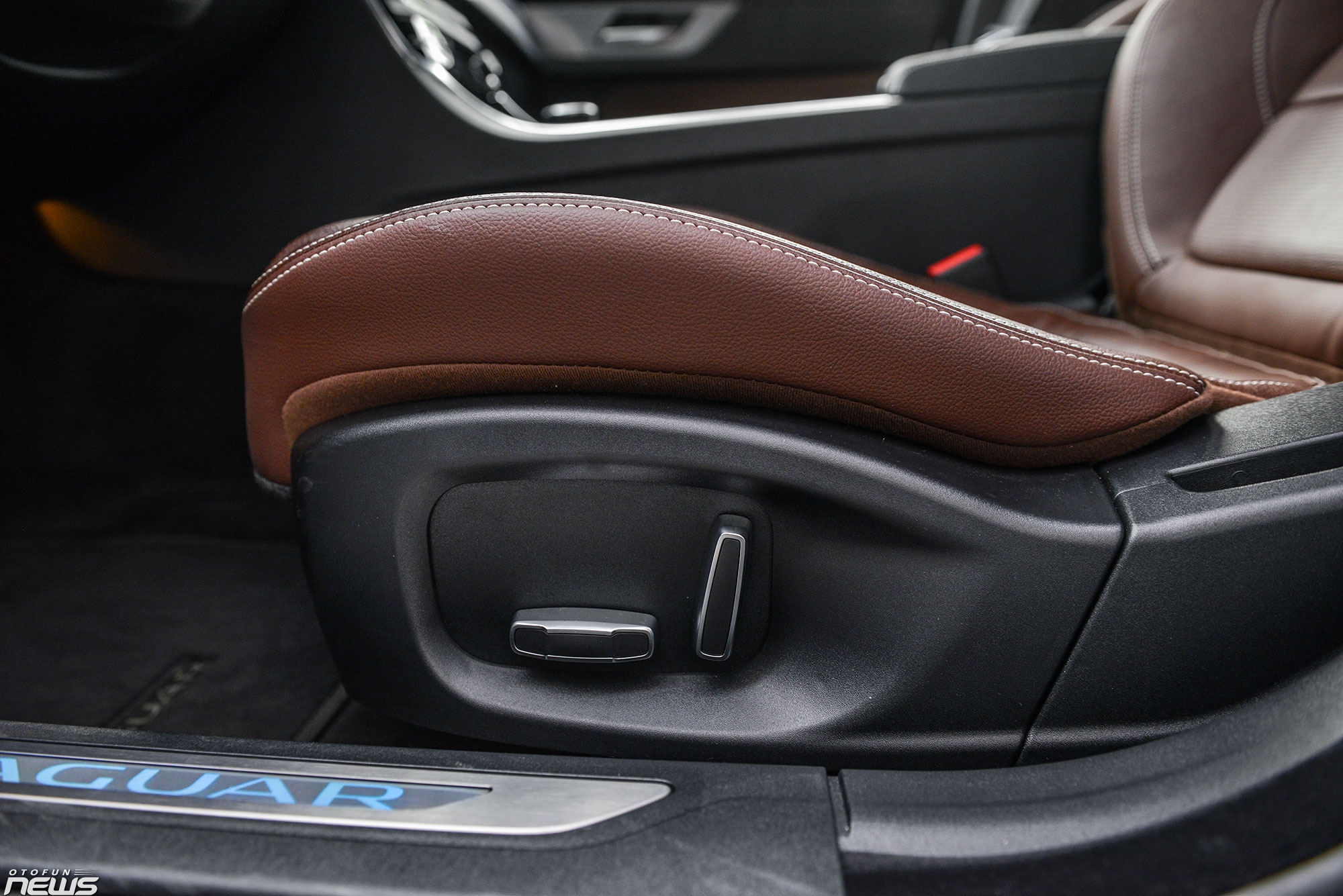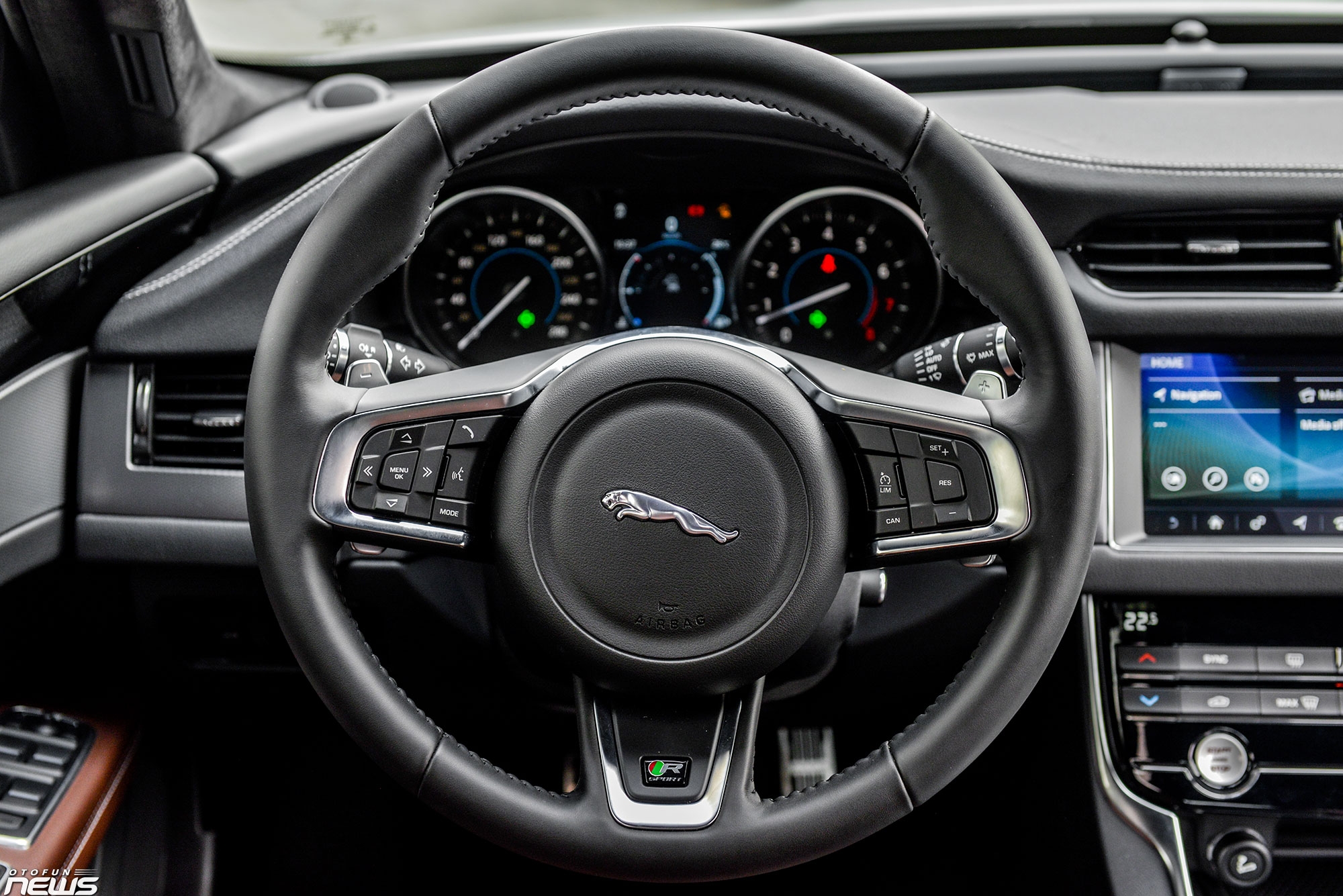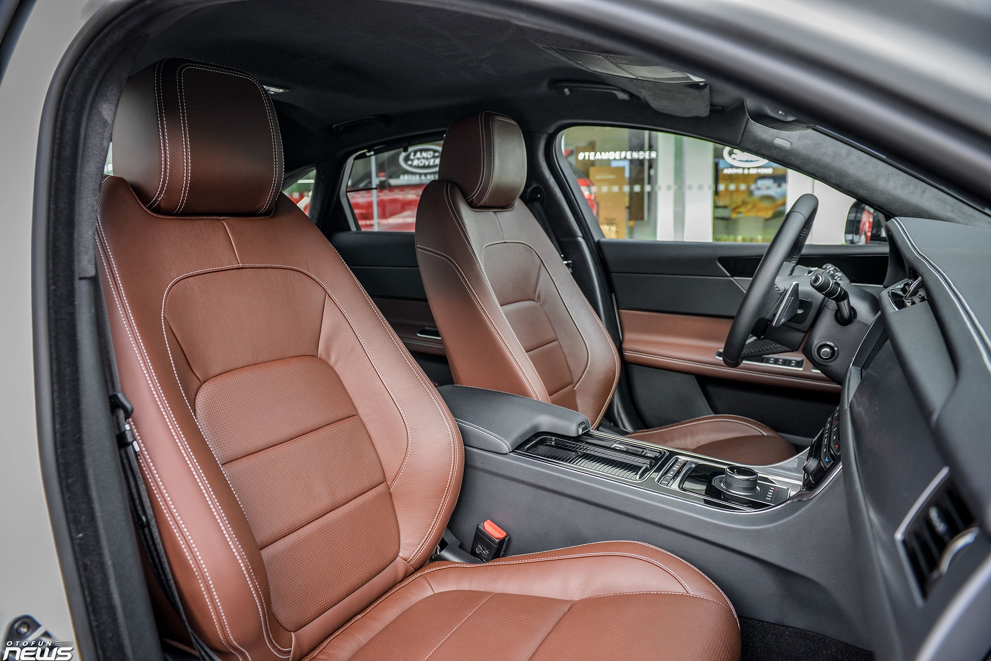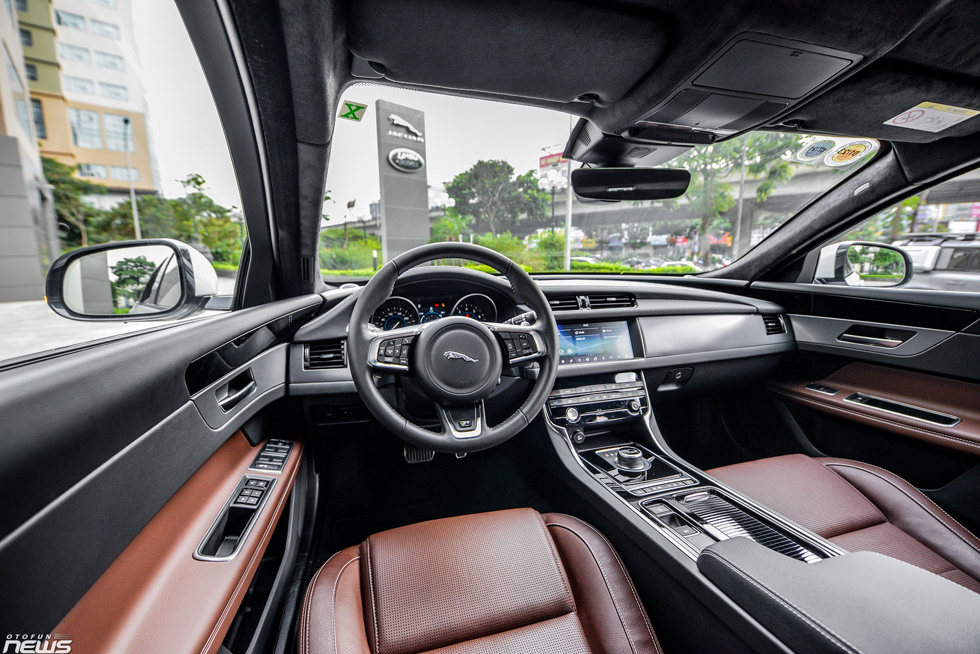 Nội thất Jaguar XF R-Sport được thiết kế giúp tối ưu hóa cho khả năng lái xe. Ghế ngồi thể thao ôm người, bọc da Taurus màu đỏ Brogue với chỉ khâu tương phản, điều chỉnh điện 10 hướng. Vô-lăng ba chấu thể thao R-Sport, bọc da, điều khiển điện. Ngoài ra, vô-lăng này còn tích hợp các phím điều khiển hệ thống giải trí, kiểm soát hành trình.