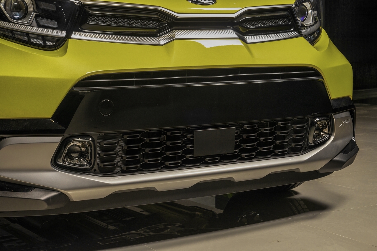 Lưới tản nhiệt phía dưới chứa các hốc đèn sương mù góc cạnh, một đường viền màu đen bao quanh và nối liền với các khe hút gió đặt thẳng đứng 2 bên nhấn mạnh tính thể thao cho phần trước của chiếc xe.