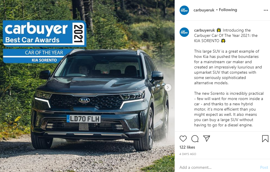 Richard Ingram, biên tập viên của Carbuyer.co.uk, cho biết: “Giải thưởng Xe gia đình cỡ lớn tốt nhất và Xe của năm 2021 của chúng tôi đã được trao cho những mẫu xe mà chúng tôi coi là hoàn hảo nhất. Kia Sorento là một chiếc SUV đa dụng đang bám sát các đối thủ cao cấp khi mang lại cảm giác sang trọng và không gian rộng rãi tương đương. Mức độ cạnh tranh ở phân khúc này là vô cùng khốc liệt nhưng không có mẫu xe nào khác có thể sánh được với những bước tiến tuyệt vời của Sorento. Xin chúc mừng Kia về một chiến thắng xứng đáng”.