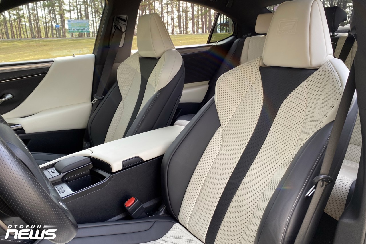 Toàn bộ ghế ngồi bọc da màu đen phối với màu trắng tương phản cùng vật liệu nhôm bóng mờ là một sự kết hợp thanh lịch và trang nhã đúng phong cách Lexus. Hàng ghế trước thiết kế ôm người thể thao, có thể chỉnh điện 8 hướng kèm nhớ ba vị trí có tính năng sưởi ấm. Logo F-Sport còn được in chìm trên tựa đầu.