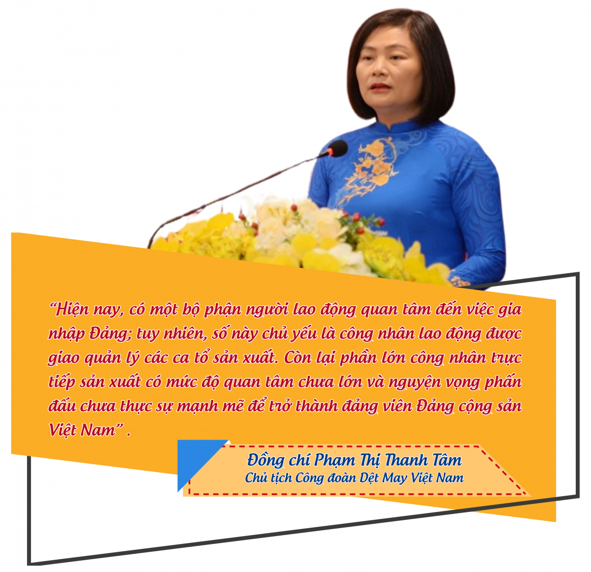 Theo khảo sát nhanh của Viện Công nhân và Công đoàn với 2000 công nhân lao động tại 100 doanh nghiệp ở 10 tỉnh, thành phố (gồm: Hà Nội, Hải Phòng, Bắc Ninh, Bắc Giang, Thanh Hóa, Nghệ An, Hồ Chí Minh, Bình Dương, Đồng Nai, Long An), 86,9% công nhân đánh giá là rất quan trọng về vai trò của ĐCSVN đối với sự phát triển của đất nước; 89,9% cho rằng cần thiết phải có tổ chức đảng tại doanh nghiệp. 84,6% những công nhân được khảo sát cho biết lý do mong muốn được vào Đảng vì có niềm tin vào sự lãnh đạo của Đảng; 50,8% mong muốn được cống hiến, đóng góp cho xã hội. Phần còn lại lý do đến từ muốn được ở trong môi trường rèn giũa, truyền thống gia đình và cơ hội phát triển nghề nghiệp. 61,3% công nhân chưa phải là đảng viên có mong muốn vào Đảng; 18,8% còn lưỡng lự, lý do chủ yếu đến từ việc bận rộn công tác chuyên môn, thời gian sinh hoạt đảng không phù hợp với giờ giấc cá nhân. Từ khảo sát cho thấy, nhận thức của công nhân về vai trò của Đảng ngày càng được nâng cao, đặc biệt trong bối cảnh hội nhập và phát triển kinh tế mạnh mẽ; các doanh nghiệp tạo điều kiện thuận lợi cho hoạt động của tổ chức Đảng, xem đây là nhân tố giúp xây dựng văn hóa doanh nghiệp, tăng cường tinh thần đoàn kết và kỷ luật lao động. Đồng thời, có sự quan tâm, chỉ đạo từ các cấp ủy Đảng, chính quyền địa phương trong việc phát triển đảng viên. Tuy nhiên việc phát triển đảng viên vẫn gặp một số hạn chế do đặc điểm, tình hình việc làm của công nhân lao động: hay thay đổi công việc; làm việc theo ca kíp; không có nhiều thời gian; đời sống, thu nhập còn khó khăn; nhận thức chính trị của một bộ phận công nhân còn hạn chế, chưa có động lực phấn đấu vào Đảng và một số doanh nghiệp, đặc biệt là doanh nghiệp FDI chưa tạo điều kiện thuận lợi cho tổ chức. Với 110.322 cán bộ, công nhân lao động, trong đó gần 90% là công nhân trực tiếp sản xuất, Công đoàn Dệt may hiện có 6.437 đảng viên, trong đó đảng viên là công nhân trực tiếp sản xuất là 2.356, chiếm 37 %. Nhận định về mức độ quan tâm và nguyện vọng phấn đấu trở thành đảng viên Đảng Cộng sản Việt Nam của công nhân lao động, đồng chí Phạm Thị Thanh Tâm - Chủ tịch Công đoàn Dệt May Việt Nam cho biết, hiện nay, có một bộ phận người lao động quan tâm đến việc gia nhập Đảng; tuy nhiên, số này chủ yếu là công nhân lao động được giao quản lý các ca tổ sản xuất. Còn lại phần lớn công nhân trực tiếp sản xuất có mức độ quan tâm chưa lớn và nguyện vọng phấn đấu chưa thực sự mạnh mẽ để trở thành đảng viên Đảng cộng sản Việt Nam. Lý do về vấn đề này, đồng chí Phạm Thị Thanh Tâm cho biết, lao động nữ của ngành chiếm trên 70%, nên mối quan tâm hàng đầu của họ là chăm sóc gia đình, nuôi dạy con cái. Do đó, đại đa số người lao động đi làm chỉ chú trọng đến việc tăng thu nhập để cải thiện cuộc sống, ít quan tâm đến các hoạt động chính trị. |