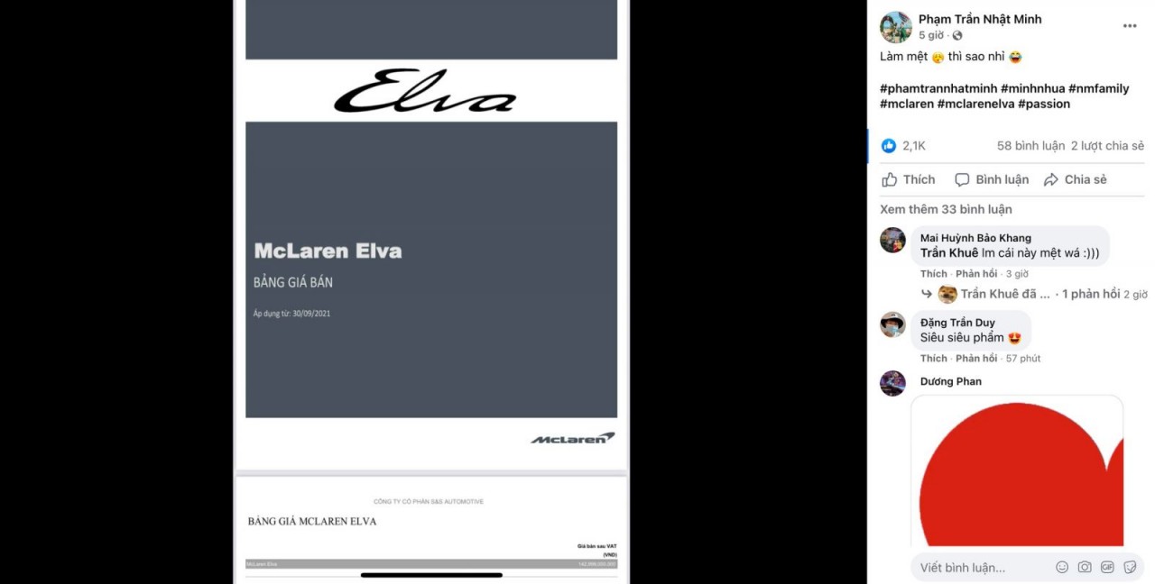 Trước đó, vào ngày ngày 10/10, "Minh Nhựa" và những người bạn được mời tham dự sự kiện trưng bày kín chiếc McLaren Elva tại TP. HCM. Đây là lần gặp gỡ công chúng duy nhất của siêu xe này tại Việt Nam trong khuôn khổ McLaren World Tour - chương trình quảng bá mẫu siêu xe này trên toàn thế giới.