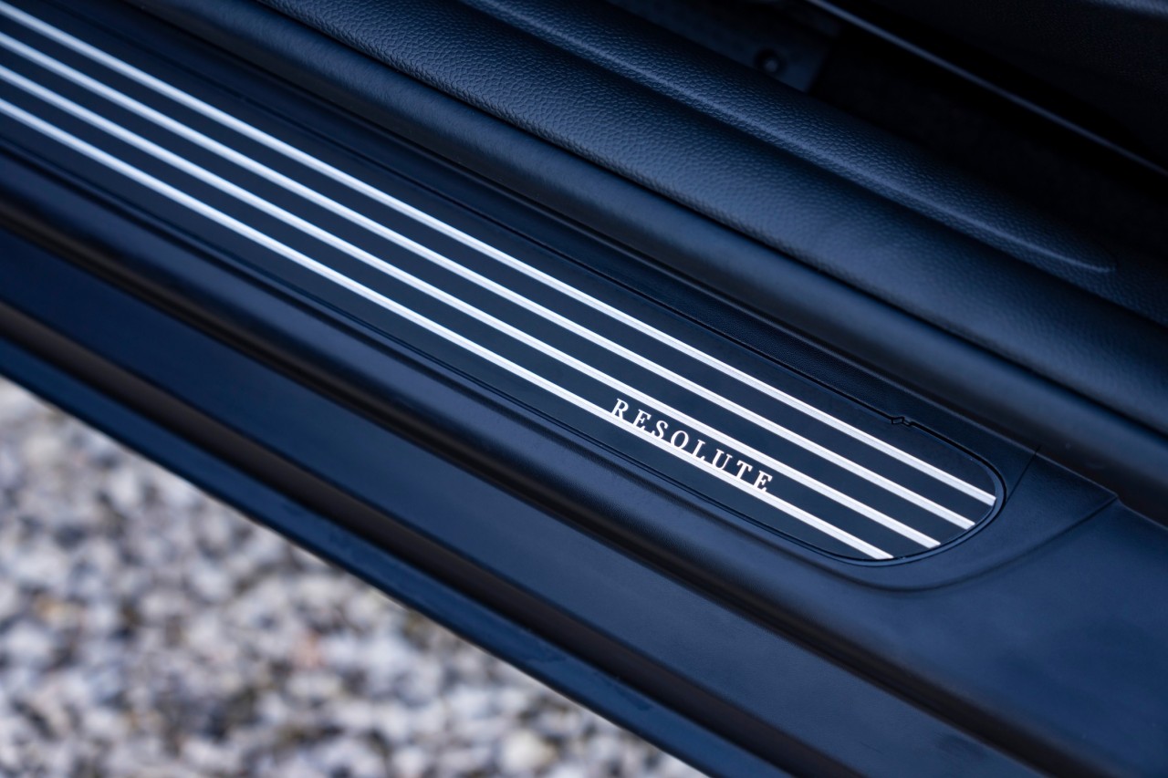 Xe được trang bị ghế trước thể thao theo gói Cloth/leatherette Black Pearl họa tiết ca-rô.Vô-lăng bọc da Nappa cao cấp với chữ “Resolute” màu vàng đồng.