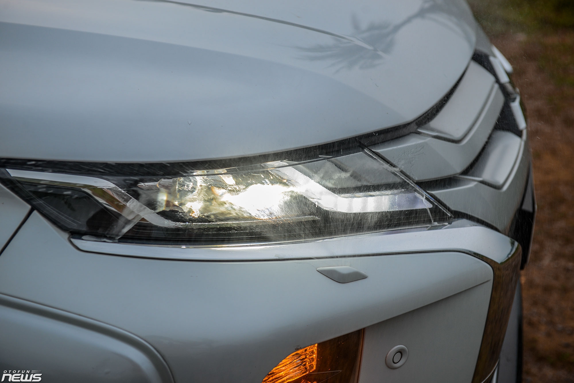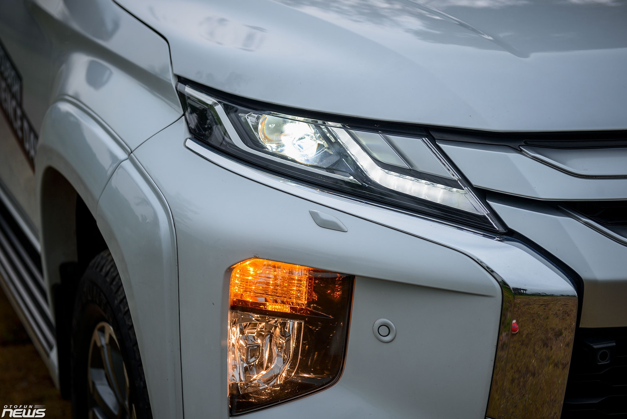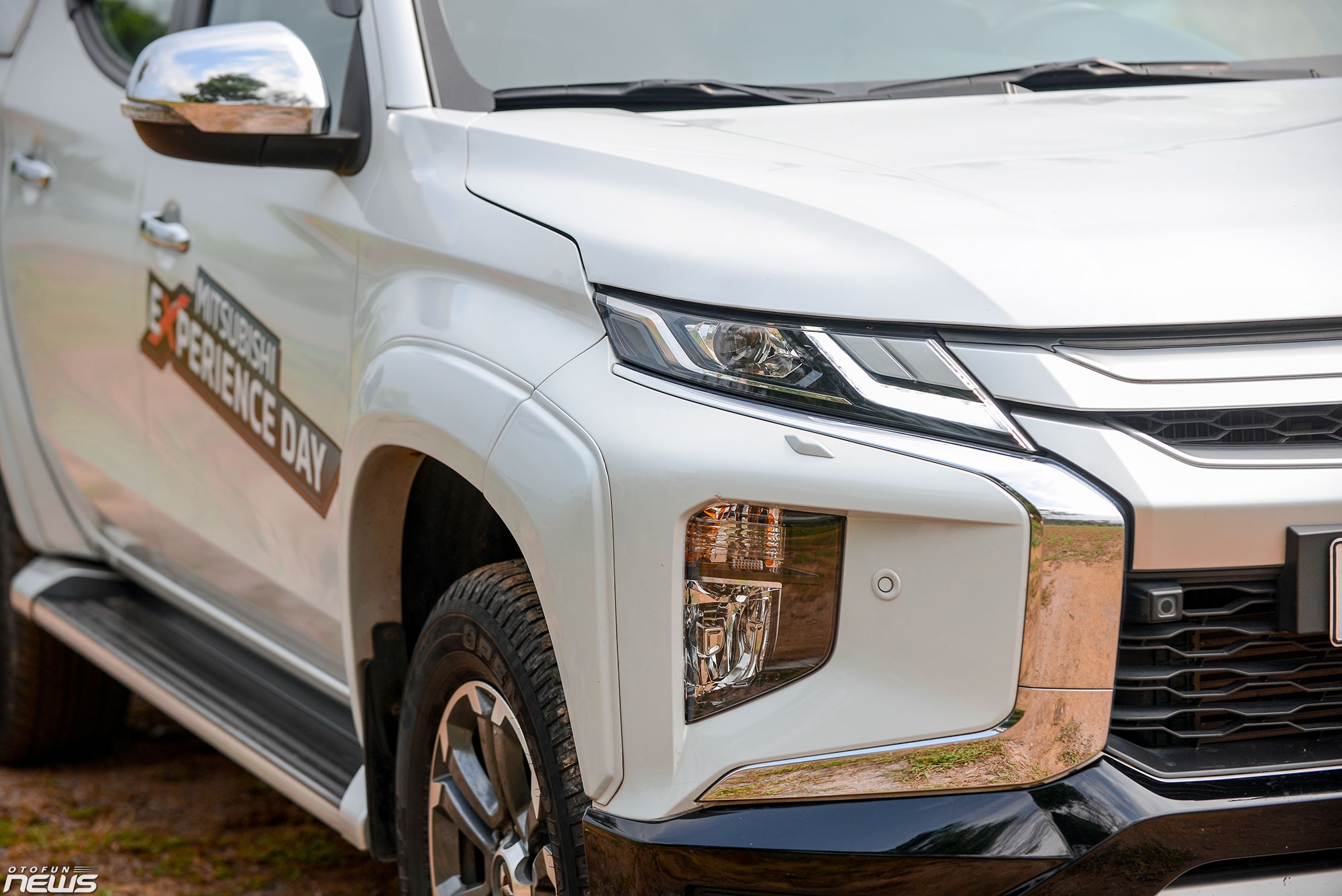 Theo kế hoạch, tôi sẽ chờ anh bạn đến đón tại một điểm định sẵn. Chiếc Triton xuất hiện từ xa, nổi bật giữa đám đông và thu hút mọi ánh nhìn. Vẫn là ngôn ngữ thiết kế Dynamic Shield nổi tiếng, đầu xe vuông vức hình chiếc khiên, đầy nam tính. Đèn chiếu sáng bi-LED tích hợp cả chiếu xa và chiếu gần kèm đèn định vị ban ngày. Ca-pô cao hơn đời cũ 100 mm tạo cảm giác bề thế hơn.