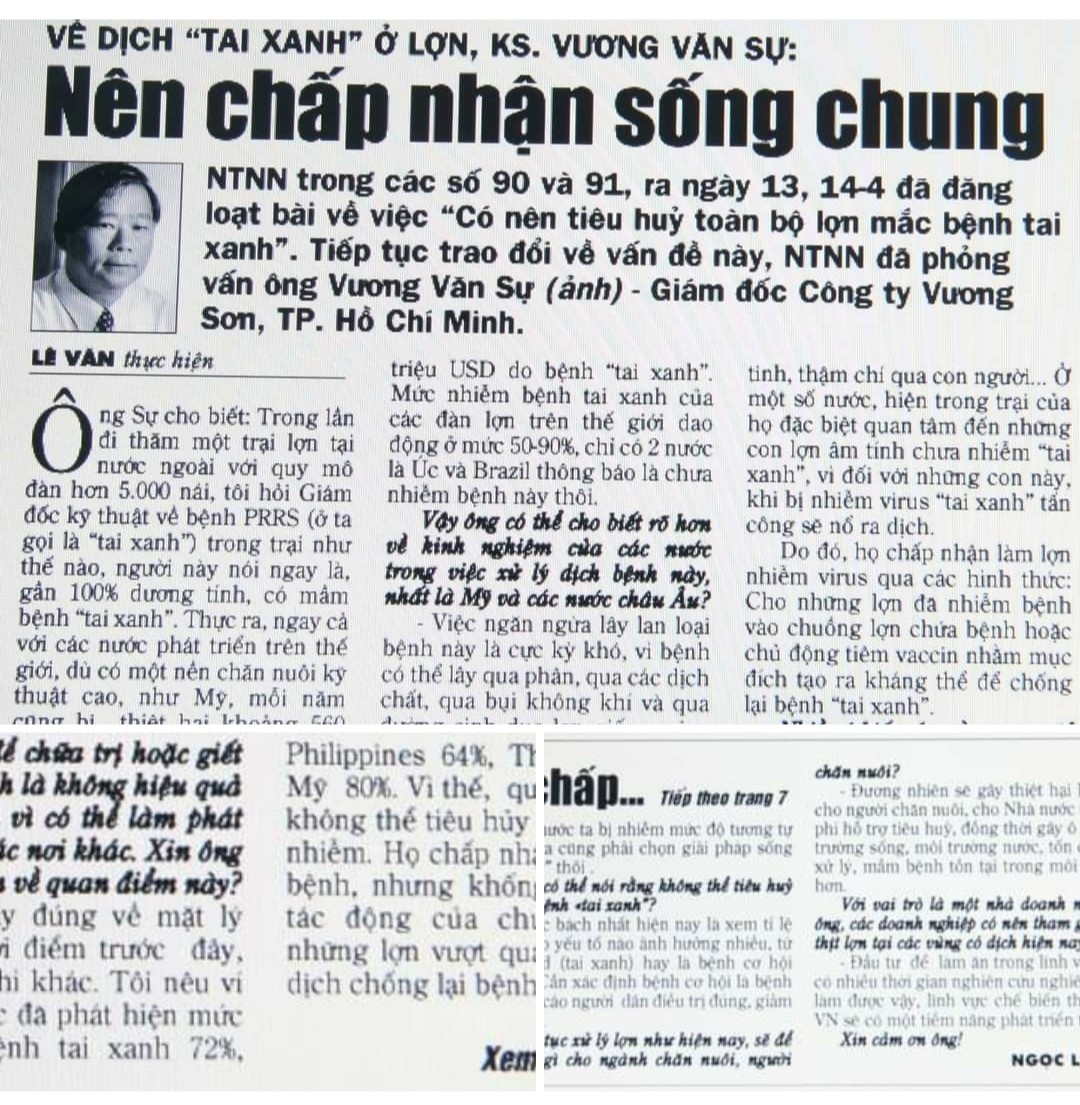 Khi bệnh lợn “tai xanh” bùng phát, anh nêu những thông tin khoa học có cơ sở của thế giới và thuyết phục người thực thi chính sách, cân nhắc có nên áp dụng các quy định lỗi thời hay không trong bài trả lời phỏng vấn của nhà báo Lê Văn, Báo Nông thôn ngày nay “Nên chấp nhận sống chung”… Anh bộc bạch: “Chấm dứt chôn sống lợn, người chăn nuôi heo trên cả nước thở phào. Mấy ông bạn của mình nuôi heo ở Đồng Nai, Bình Dương điện thoại cho biết là cả triệu con lợn đã được cứu sống! Lúc ấy mình xúc động vô cùng. Đó cũng là thời điểm hạnh phúc nhất sau bao nhiêu năm tham gia cầm bút làm nhà báo không chuyên… bất đắc dĩ!”.