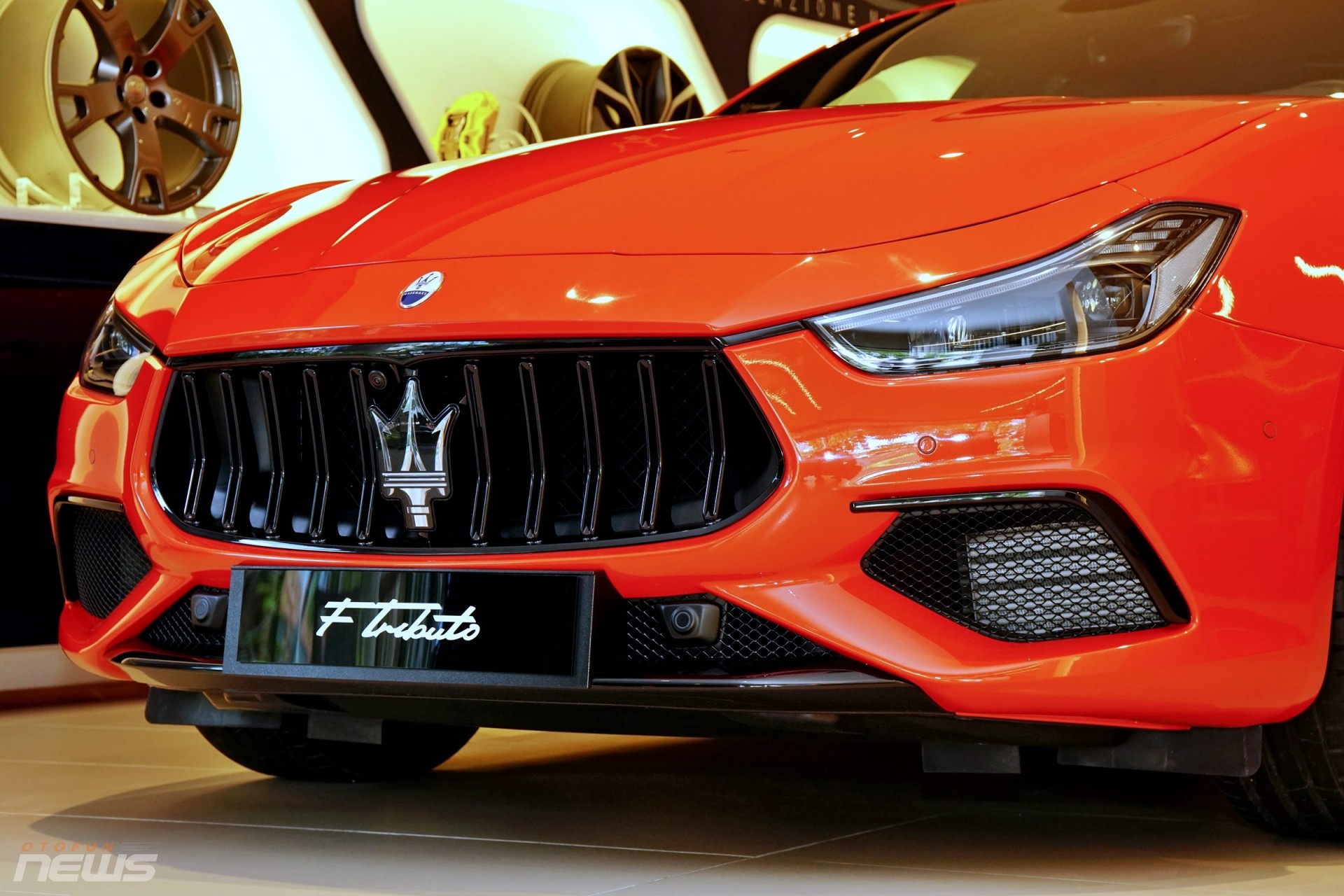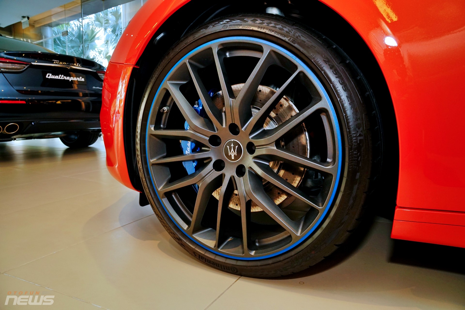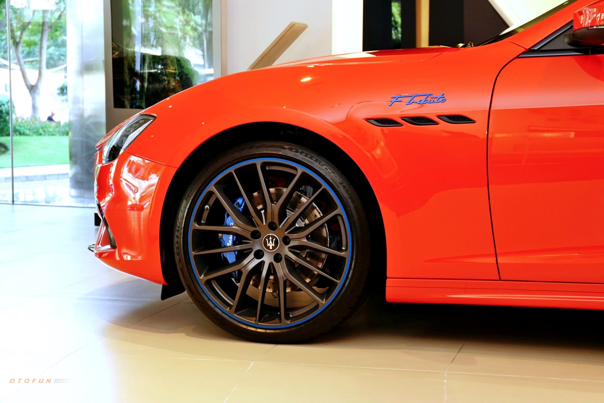 Ngoài bộ cánh màu cam độc đáo, chiếc Ghibli F Tributo Special Edition trong bài viết này còn "diện" bộ mâm Titano 21 inch đen bóng với kẹp phanh thể thao xanh mờ.