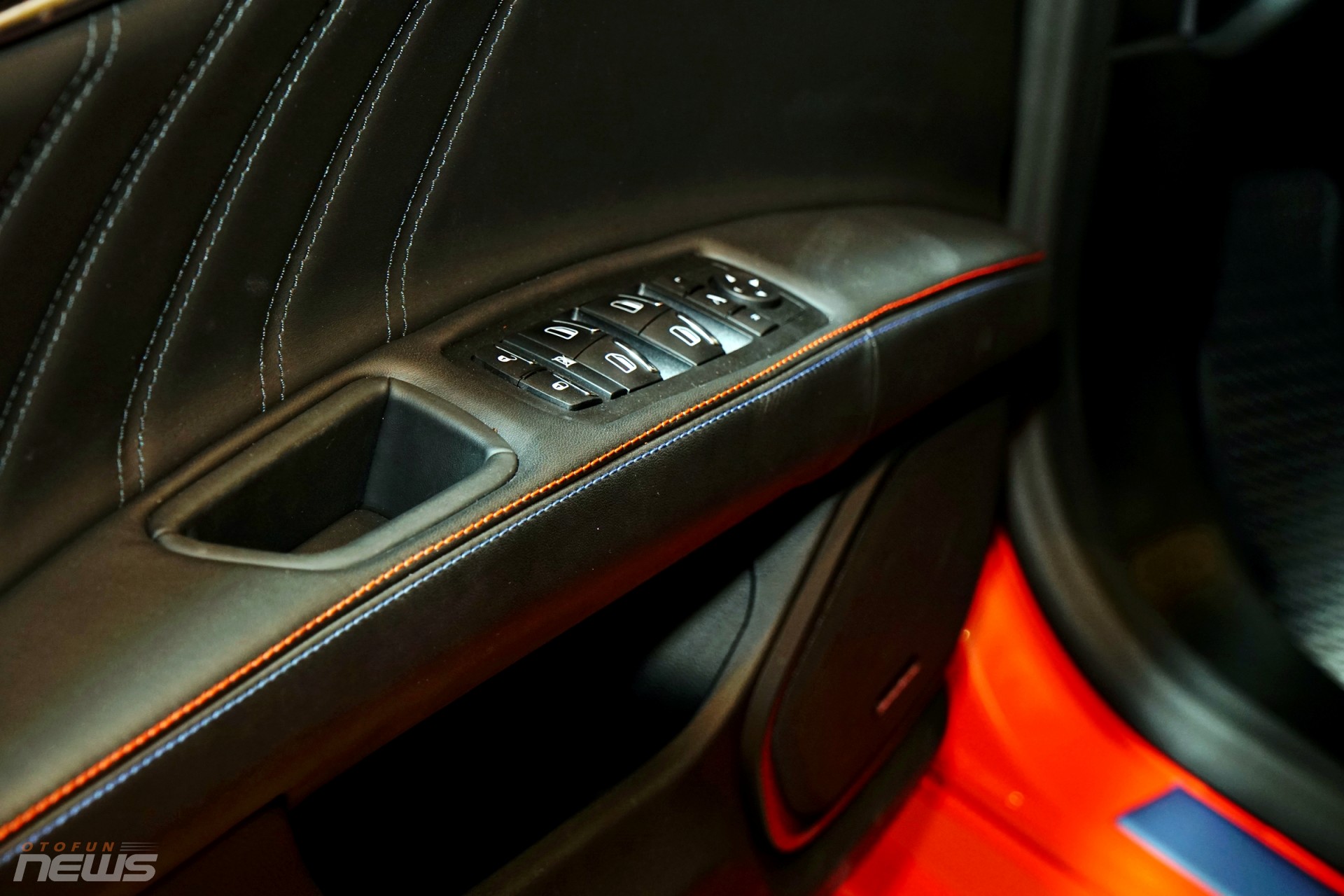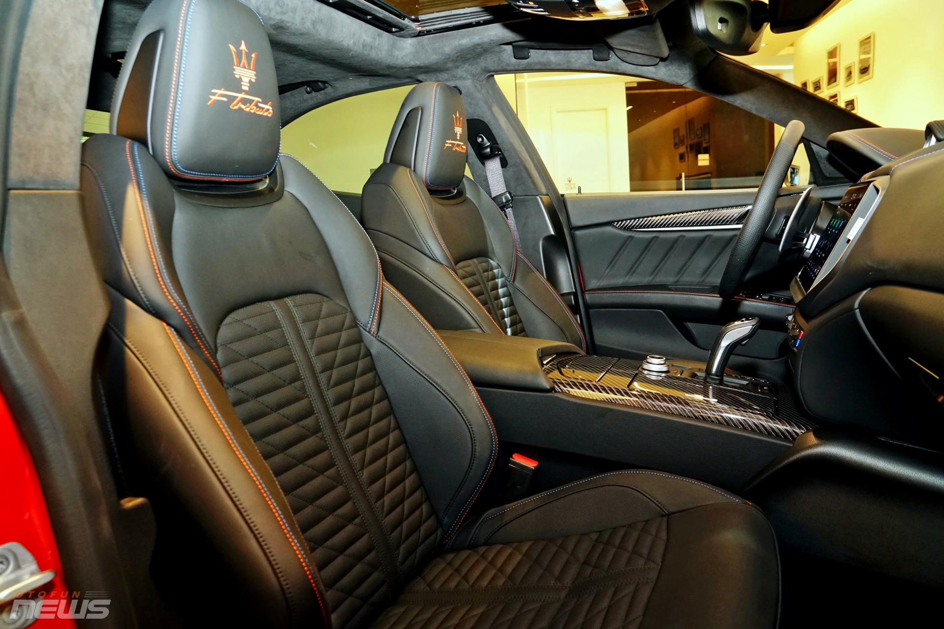 Bên trong nội thất được bọc da hoàn thiện với đường chỉ màu xanh coban kết hợp với màu cam nổi bật, cùng chất liệu da tự nhiên cao cấp nhất PienoFiore (Full-Grain) màu đen đi cùng các chi tiết được ốp bằng sợi carbon đậm chất thể thao.