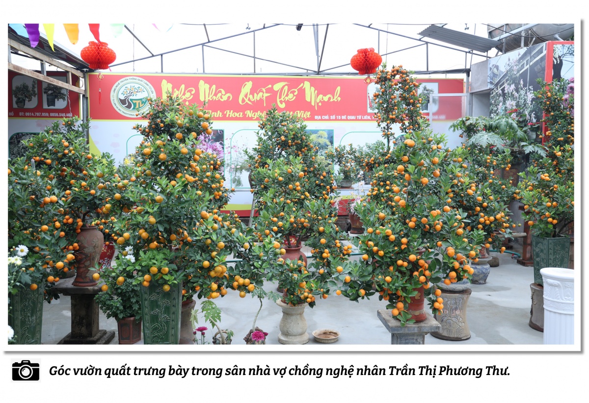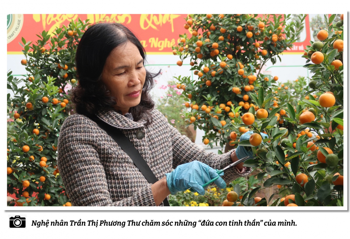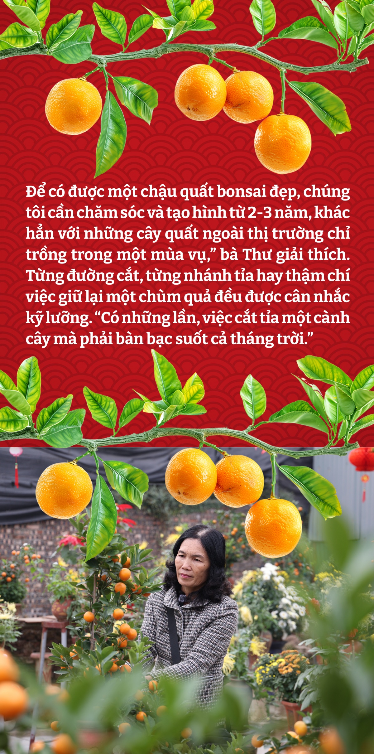 "Muốn có cây đẹp, mỗi dáng cây tôi phải mất 3 đến 5 năm. Chăm cây như chăm con mọn, phải uốn nắn, tỷ mỹ vào từng chút. Mỗi năm phải sửa 2-3 lần, có khi cắt cả những cành lớn để làm lại. Đất trồng phải tơi xốp, giàu dinh dưỡng. Chỉ khi tự tay chăm sóc, mới hiểu hết giá trị của từng chậu cây," bà chia sẻ. Muốn có dáng quất đẹp, phải tư duy từ lúc bắt đầu. Chọn dáng long phượng, người thợ phải kiên nhẫn, hai mươi, ba mươi cây mới chọn ra được một. Cành trên, cành dưới phải uốn làm sao như rồng bay, không thể vài năm là xong. Chồng bà Thư, ông Nguyễn Thế Mạnh, cũng là một nghệ nhân quất nổi tiếng. Hai vợ chồng vẫn nhắc về con số 10 năm – quãng thời gian "tạm gọi là thành công", mua được những vật dụng có giá trị đầu tiên trong nhà. Ba mươi năm, tiếng lành vượt khỏi làng nghề, vườn quất nhà bà Thư đã trở thành một địa chỉ uy tín. Những khách quen lại tìm đến mỗi khi xuân về. Cây quất bà trồng không chỉ đẹp về dáng, thế, mà còn trĩu quả, vàng tươi, mang đậm hương vị truyền thống của ngày Tết.