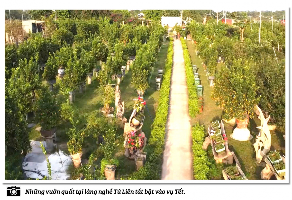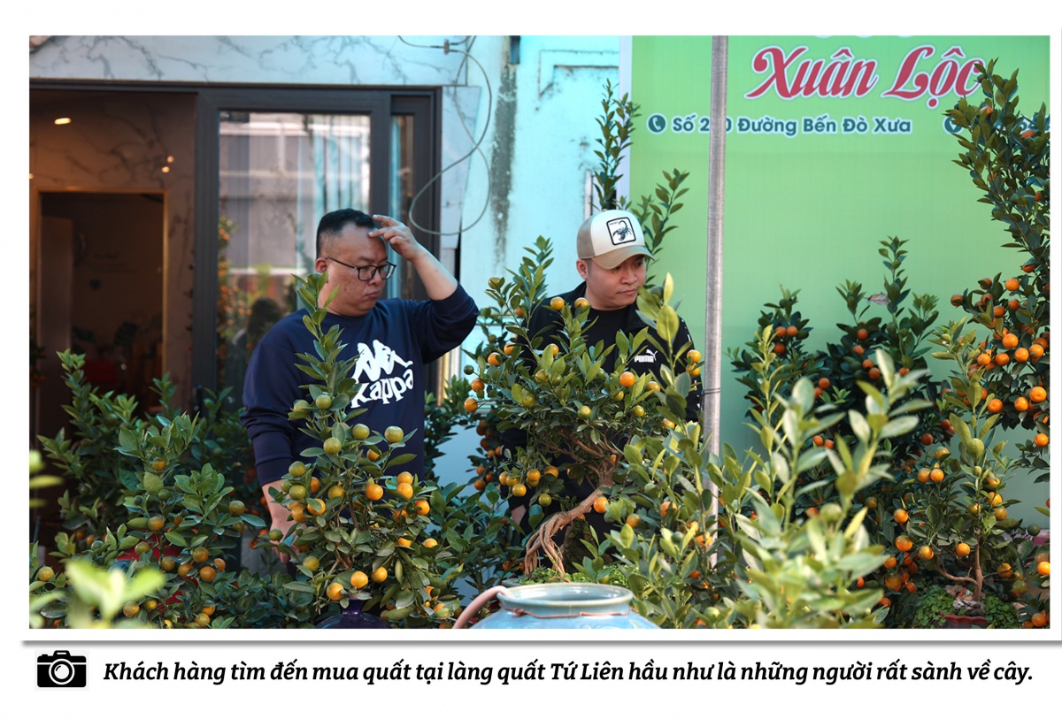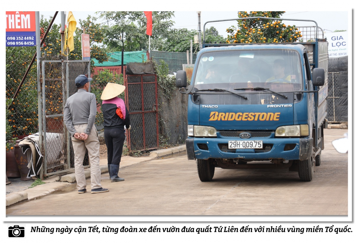 | Giữa lòng Hà Nội ồn ã, tấp nập, làng quất Tứ Liên như một ốc đảo bình yên, nơi thời gian dường như chậm lại. Đây là "thủ phủ" của những vườn quất tràn ngập sắc xuân, nơi hồn Tết như bắt đầu từ rất sớm. Những vườn quất xanh tươi với sắc vàng óng ánh của quả chín, kèm theo tiếng nói cười của khách hàng… đã vẽ nên một bức tranh ngày Tết đầy sức sống. Cây quất, vốn được trồng ở đất Nghi Tàm (nay thuộc phường Quảng An, Hà Nội), đã có cơ duyên "thiên di" sang Tứ Liên từ những năm 1970. Khu vực ven sông Hồng với đất đai màu mỡ, phù sa trù phú, trở thành môi trường lý tưởng cho quất sinh trưởng. Hiện nay, làng nghề quất Tứ Liên đã phát triển đạt hơn 100 ha, trong đó khoảng 40 ha dành cho quất cảnh, trải dài dọc bên sông. Bà Ngô Thị Ngà, Chủ tịch Hội Làng nghề quất cảnh truyền thống Tứ Liên, chia sẻ, cả làng có gần 500 hộ trồng quất, tạo việc làm cho hơn 600 lao động. Vào vụ Tết, người làng phải thuê thêm lao động thời vụ.