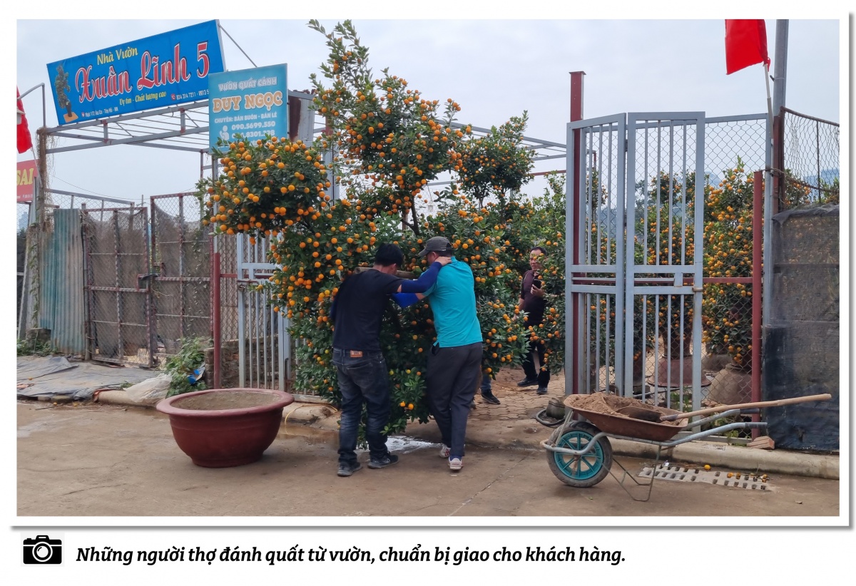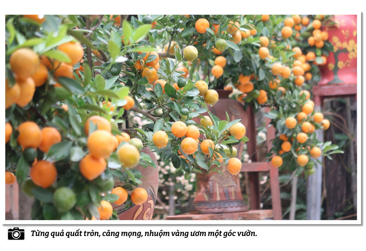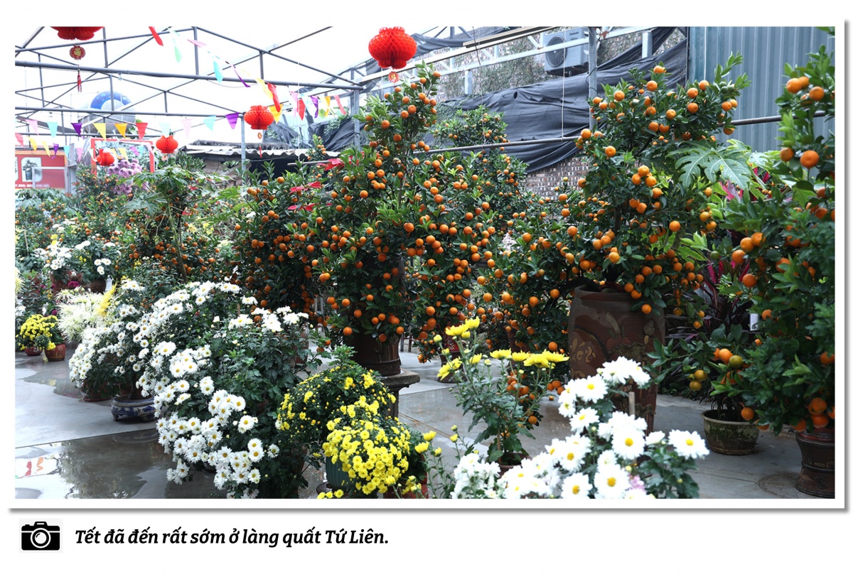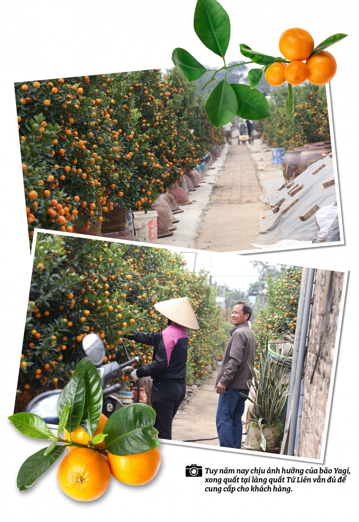 | Giữa lòng Hà Nội ồn ã, tấp nập, làng quất Tứ Liên như một ốc đảo bình yên, nơi thời gian dường như chậm lại. Đây là "thủ phủ" của những vườn quất tràn ngập sắc xuân, nơi hồn Tết như bắt đầu từ rất sớm. Những vườn quất xanh tươi với sắc vàng óng ánh của quả chín, kèm theo tiếng nói cười của khách hàng… đã vẽ nên một bức tranh ngày Tết đầy sức sống. Cây quất, vốn được trồng ở đất Nghi Tàm (nay thuộc phường Quảng An, Hà Nội), đã có cơ duyên "thiên di" sang Tứ Liên từ những năm 1970. Khu vực ven sông Hồng với đất đai màu mỡ, phù sa trù phú, trở thành môi trường lý tưởng cho quất sinh trưởng. Hiện nay, làng nghề quất Tứ Liên đã phát triển đạt hơn 100 ha, trong đó khoảng 40 ha dành cho quất cảnh, trải dài dọc bên sông. Bà Ngô Thị Ngà, Chủ tịch Hội Làng nghề quất cảnh truyền thống Tứ Liên, chia sẻ, cả làng có gần 500 hộ trồng quất, tạo việc làm cho hơn 600 lao động. Vào vụ Tết, người làng phải thuê thêm lao động thời vụ.