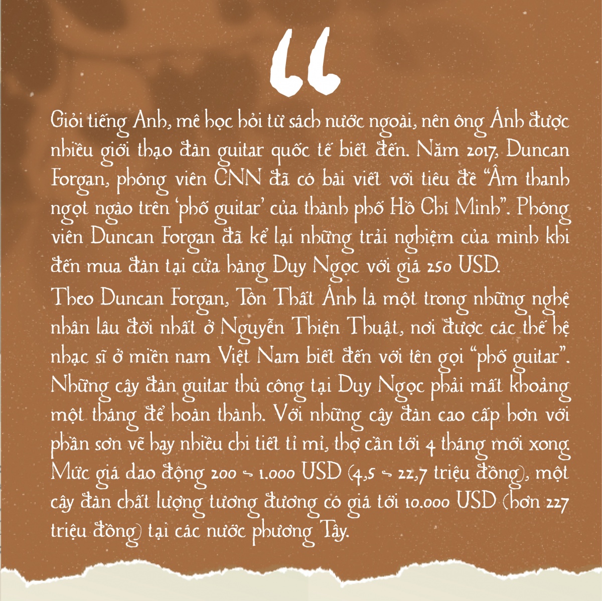 Khác với cơ sở Ba Đờn chuyên sản xuất đàn công nghiệp, tiệm đàn Duy Ngọc chỉ làm đàn thủ công bằng tay (handmade). Ở đó, ông Ánh là chủ và cũng kiêm luôn là người thợ duy nhất. Trong thời đại công nghệ phát triển, nhiều cây đàn sản xuất công nghiệp với giá rẻ tràn ngập thị trường, khiến nghề làm đàn thủ công ngày càng mai một. Nhiều thợ đàn bỏ nghề vì không thể cạnh tranh. Nhưng ông Ánh vẫn kiên trì với mong muốn giữ gìn cái hồn của nghề. “Nghề này bây giờ ít người làm lắm, vì nó không nhanh giàu được. Nhưng tôi nghĩ, nếu ai cũng bỏ, thì sẽ mất đi những cây đàn có hồn. Tôi chỉ mong truyền lại đam mê này cho thế hệ sau” ông Ánh nói, đôi mắt ánh lên niềm hy vọng. Và quả thật, có không ít bạn trẻ yêu nhạc tìm đến ông để học hỏi. Dù biết con đường phía trước còn nhiều khó khăn, ông Ánh vẫn sẵn lòng chỉ dạy, vì với ông, tình yêu dành cho đàn không chỉ nằm ở những sản phẩm hoàn thiện, mà còn ở việc giữ lửa cho những ai chung niềm đam mê và cảm xúc. |