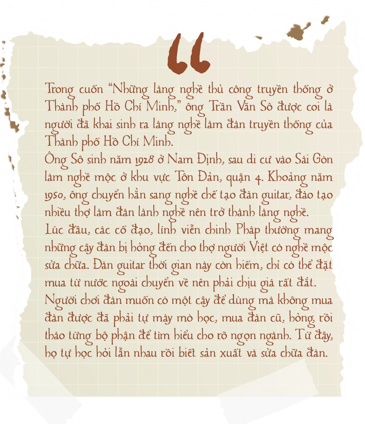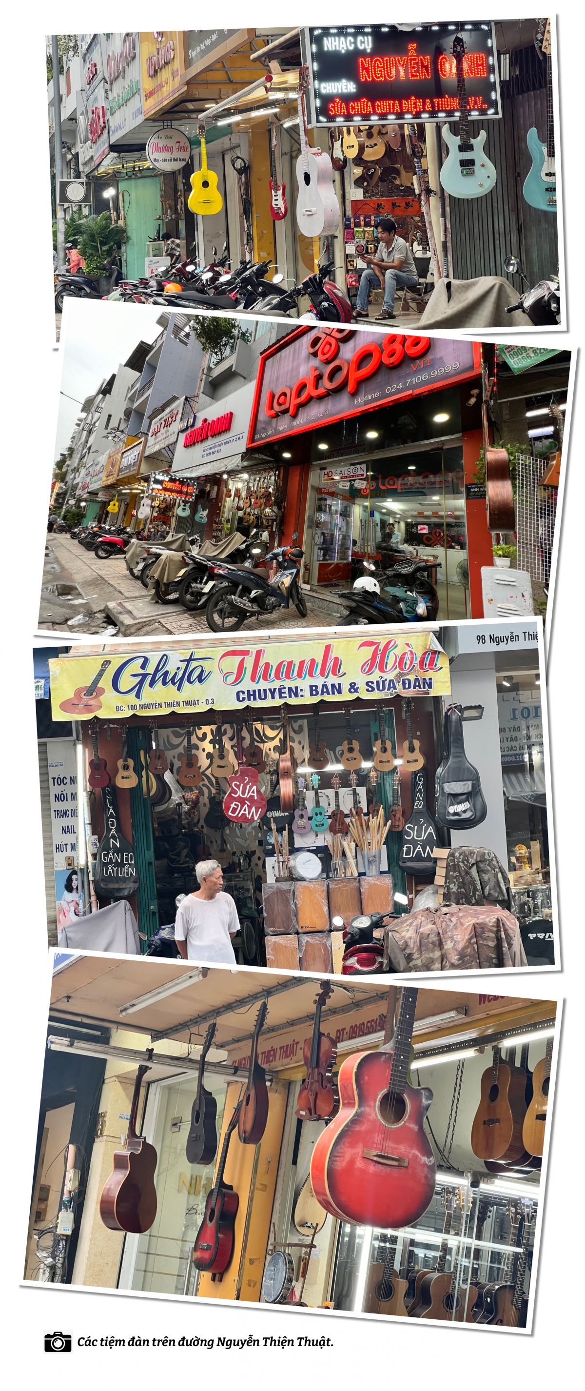 Đường Nguyễn Thiện Thuật có chiều dài chưa đến 1 km, bắt đầu từ đường Nguyễn Thị Minh Khai và kết thúc ở đường Điện Biên Phủ; nhưng có gần 30 tiệm đàn, nên người dân quen gọi là “phố đàn. Ngoài những cửa tiệm có đóng đàn như ông Ánh, phần lớn đàn bán tại đây đều có nguồn gốc từ cơ sở Ba Đờn, xưởng sản xuất nổi tiếng ở TP Hồ Chí Minh từ trước năm 1975. “Ba Đờn” tên thật là Nguyễn Văn Trân (SN 1947, quê ở Bến Tre), lên Sài Gòn lập nghiệp từ những năm 60 của thế kỷ trước. Năm 13 tuổi, ông theo học nghề làm đàn của một nghệ nhân người Bắc, 3 năm sau thì thành nghề. Sau hơn 10 năm làm thuê cho các cơ sở sản xuất đàn, năm 1975, “Ba Đờn” tách ra làm riêng và tạo dựng được thương hiệu “guitar Ba Đờn”. Hiện tại, đây là một trong hai cơ sở cuối cùng của làng nghề làm đàn thủ công truyền thống đã tồn tại hơn nửa thế kỷ ở TP Hồ Chí Minh. |