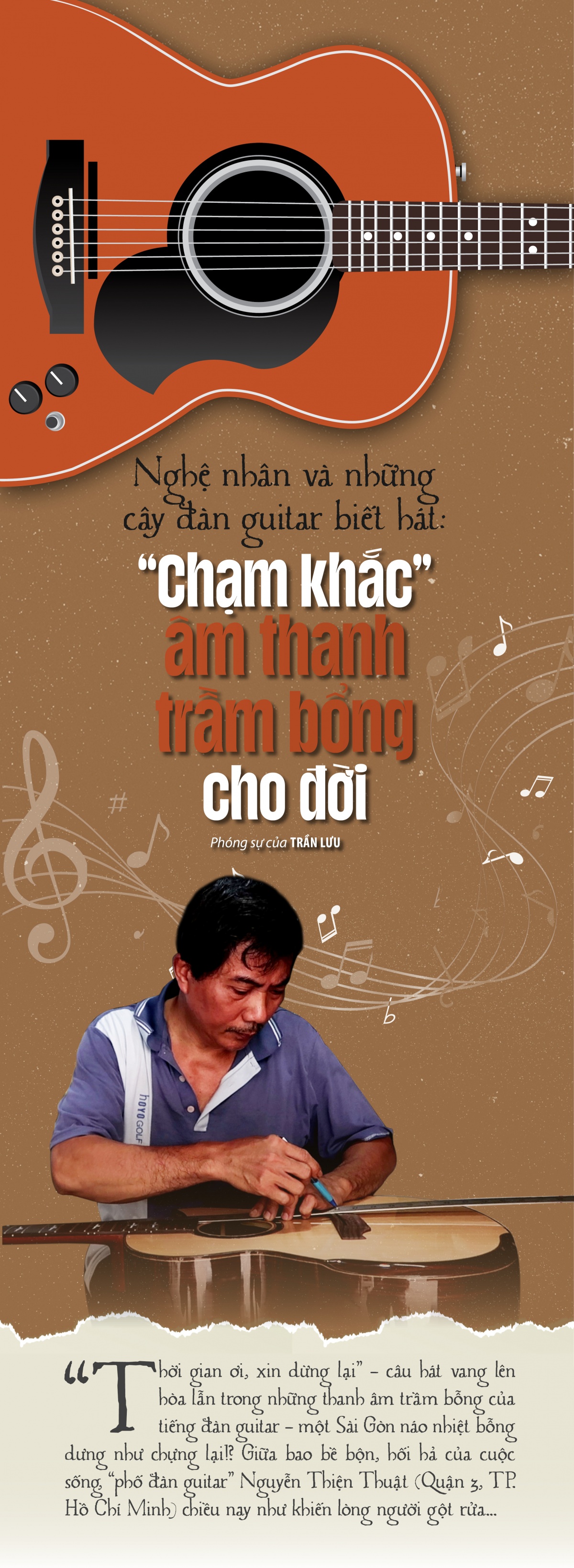 Từ những năm đầu của thập niên 80, phố đàn Nguyễn Thiện Thuật đã là điểm đến quen thuộc của những người yêu nhạc. Ban đầu chỉ có vài cửa hàng nhỏ lẻ, nhưng theo thời gian, đã trở thành một trung tâm mua sắm nhạc cụ phong phú và đa dạng. Không chỉ phục vụ nhu cầu của cả những nghệ sĩ chuyên nghiệp lẫn người chơi bình dân, mà còn tạo ra nhiều công ăn việc làm cho người dân. Hôm tôi đến phố đàn, ông Trần Văn Quang (SN 1953) cũng mang 2 cây đàn đi sửa. Đam mê đàn guitar từ bé, đặc biệt khi nghe Khánh Ly hát nhạc Trịnh, nghe độc tấu guitar, ông đã coi âm nhạc (nhất là nhạc Trịnh) như một người bạn tri kỷ. Năm 15 tuổi, bé Quang tiết kiệm từng đồng bạc lẻ từ những bữa ăn sáng, mua được cây đàn guitar đầu tiên. Ngoài thời gian học ở trường, ông suốt ngày ôm đàn tập hát. Không có thầy trực tiếp hướng dẫn, ông nghe băng cát-xét rồi kiên trì luyện tập theo từng “câu lead, những khúc giang tấu và cả những khoảng lặng bất chợt để nhấn nhá từng node nhạc thâm trầm hay réo rắt mà chỉ có cây guitar cùng những ngón đàn đặc thù mới chuyển tải được”!? Từ trong chiến tranh đến thời bình, nhiều khi dù trong túi không có cắc bạc nào, cây đàn guitar vẫn không bao giờ rời xa ông. |