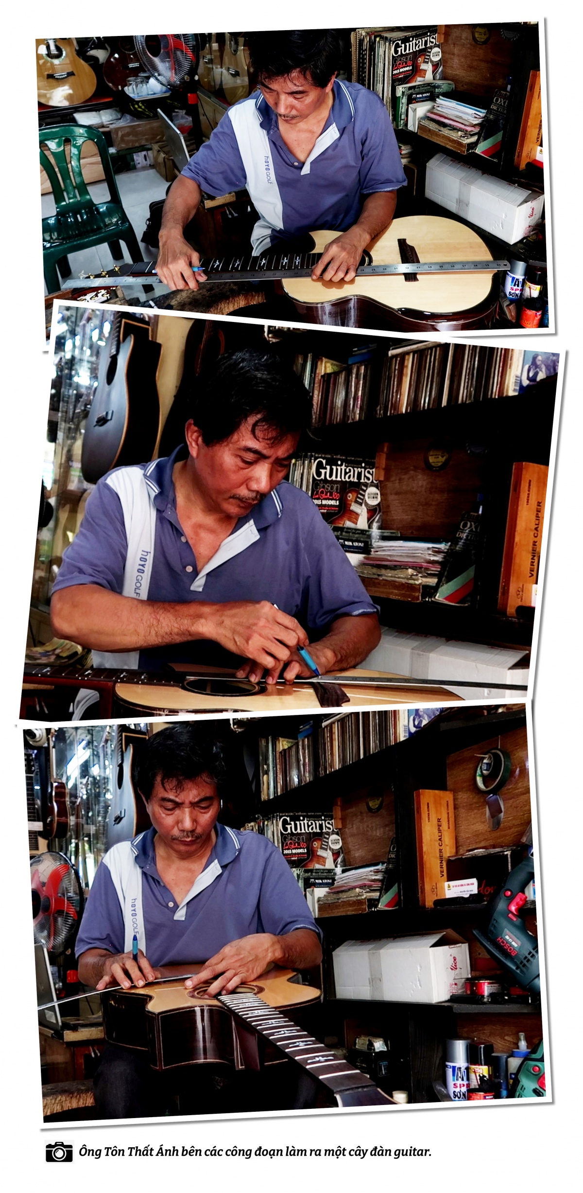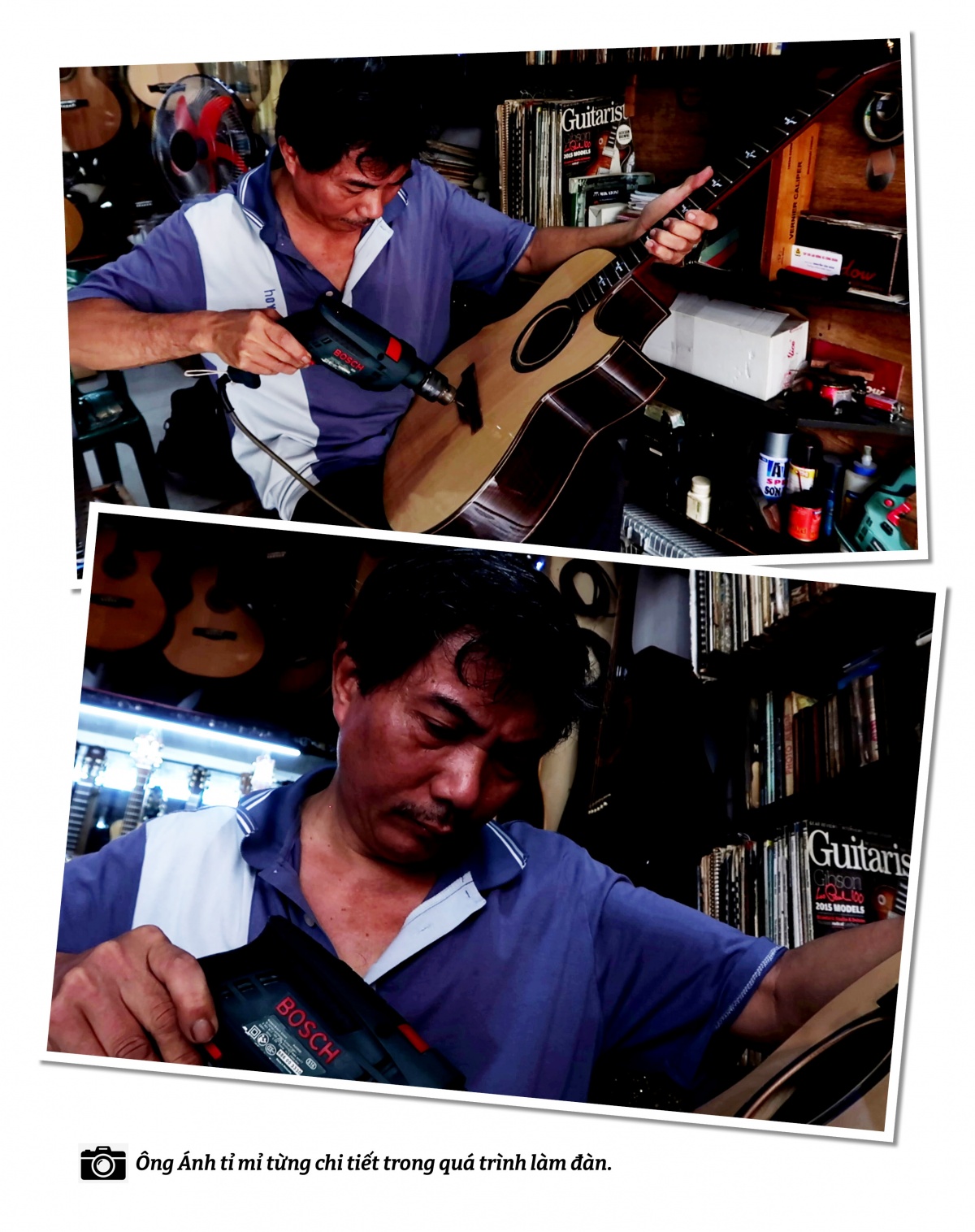 Theo ông Ánh, cấu tạo của đàn guitar 6 dây gồm 10 bộ phận, bao gồm: cần đàn, đầu đàn, ty chỉnh đàn, dây đàn, thùng đàn, phím đàn, lược đàn, ngăn phím, chốt giữ dây, cầu ngựa đàn. Trong đó, dây đàn thường được làm bằng dây nylon hoặc kim loại (thường gọi là dây sắt). Để làm một cây đàn rất công phu. Gỗ nhập về phải xử lý kỹ để đạt đến độ ẩm nhất định rồi làm khuôn và cầu vành bên trong. Mặt đàn bào nhẵn với độ dày vừa đủ để cho âm thanh đúng như yêu cầu mới ráp vào khung. Sau khi dán keo phần thân đàn, nghệ nhân tranh thủ làm các chỉ viền xung quanh. Tiếp theo là đẽo cần và lá cần để gắn vào thân rồi đánh bóng, và sơn… |