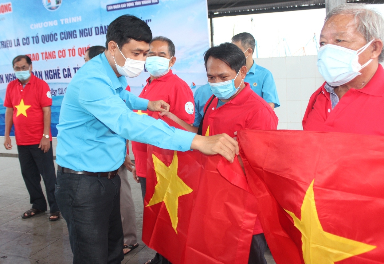 | Chủ tịch LĐLĐ tỉnh Khánh Hòa Nguyễn Thanh Bình trao cờ Tổ quốc cho bà con ngư dân Nghiệp đoàn Nghề cá. Ảnh: BKH |