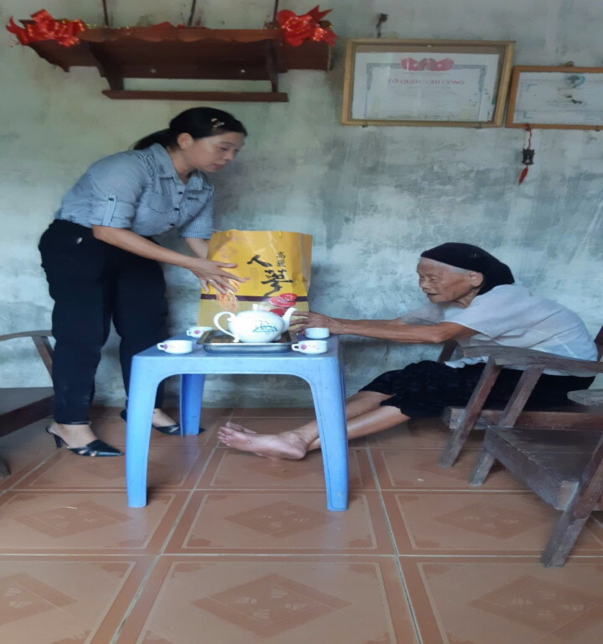 | Đồng chí Phùng Thị Thúy Hường - Chủ tịch Công đoàn tặng quà cho Mẹ liệt sĩ thôn Muỗi nhân dịp 27/7. Ảnh: ĐVCC |