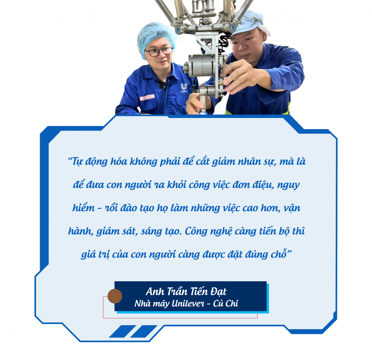 Điển hình là tại phân xưởng Personal care, anh Đạt tiếp tục ghi dấu ấn khi triển khai thành công hệ thống robot Spider để tự động hóa công đoạn cấp chai – một công việc dễ gây mỏi mệt, gây nên sự nhàm chán và dễ gây mất an toàn. Dự án này đã áp dụng thành công cho 4/5 dây chuyền chạy chai. “Tự động hóa không phải để cắt giảm nhân sự, mà là để đưa con người ra khỏi công việc đơn điệu, nguy hiểm – rồi đào tạo họ làm những việc cao hơn, vận hành, giám sát, sáng tạo. Công nghệ càng tiến bộ thì giá trị của con người càng được đặt đúng chỗ”, anh tâm sự. Nhà máy Unilever - Củ Chi là nơi chuyên sản xuất các sản phẩm tẩy rửa gia dụng dạng lỏng lớn nhất khu vực châu Á với công suất tối đa đạt trên 5 triệu sản phẩm/ngày. Anh Nguyễn Văn Quân – công nhân vận hành dây chuyền cũng bày tỏ: “Từ ngày có robot cấp chai, tụi em đỡ cực hẳn. Không phải bưng bê nhiều, cũng không còn sợ bị trầy tay, nhầm chai như trước. Anh Đạt luôn lắng nghe góp ý của tụi em rồi điều chỉnh cho phù hợp – ảnh không xa cách như kỹ sư, mà gần gũi như một người anh”. “Công nghệ không phải là thứ xa xôi. Nó là những thay đổi rất thật, rất gần, bắt đầu từ những người chịu lắng nghe, chịu thử, và chịu làm. Nếu mỗi người kỹ sư đều nghĩ đến công nhân, đến doanh nghiệp, thì chúng ta có thể tạo ra một môi trường sản xuất không chỉ hiện đại – mà còn tử tế”, anh Đạt tâm niệm. |