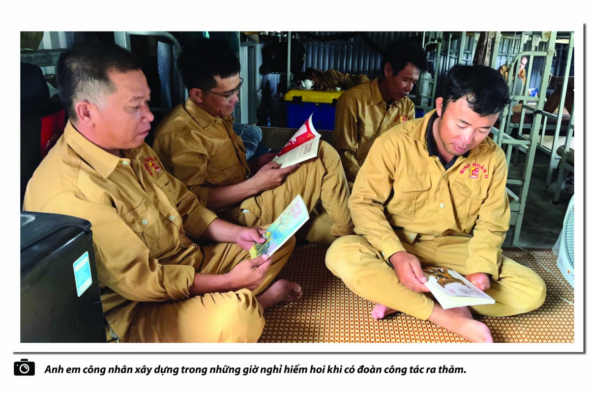 Bên cạnh lực lượng “thợ lính”, là những người “lính thợ”. Trung tá Đặng Ngọc Trung, Chính trị viên Cụm 2, người con của vùng đất Thanh Miện (Hải Dương), mang trong mình một hành trình dài với những năm tháng gắn bó với các công trình biển đảo, bởi anh vốn dĩ là sĩ quan công binh. Từ âu tàu Song Tử Tây đến nhà chỉ huy đảo Trường Sa Đông và cả công trình chùa trên đảo Sơn Ca này, Trung đều có mặt cùng anh em xây dựng. Hỏi về sự khó khăn của lính thợ xây Trường Sa, Trung chia sẻ, đặc thù của lính thợ đi xây dựng các công trình là không có doanh trại chính quy như bộ đội mà thường ở tạm lán trại tự dựng, vì thế việc ăn ở sinh hoạt cũng vất vả, thiếu thốn hơn. Nhất là trong điều kiện biển đảo, việc đảm bảo khó khăn, các anh cũng phải tổ chức trữ nước ngọt, trồng rau, tăng gia, đi đến đâu triển khai ở đấy, để phục vụ đời sống sinh hoạt cho những người lính thợ.