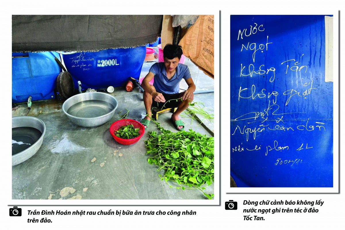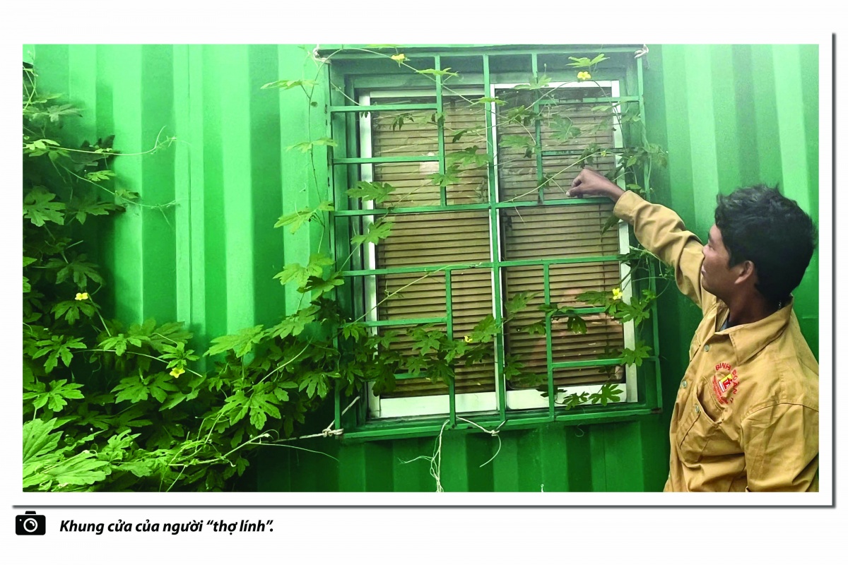 Phía sau lưng chỗ Hoán ngồi nhặt rau là téc nhựa đựng nước ngọt. Tôi để ý trên mặt téc có ghi dòng chữ “Nước ngọt. Không tắm. Không giặt. Nếu phi phạm 1 lít 500K”. Là bởi nước được cấp theo tiêu chuẩn trong ngày cho mỗi người 10 lít sử dụng cá nhân, còn nước ở téc dùng cho những nhu cầu chung khác, không ai được lấy thêm sử dụng riêng. Câu cảnh báo như một lời nhắc nhở nghiêm khắc. Theo chân các công nhân vào khu nhà ở tìm hiểu thêm về cuộc sống của họ, Nguyễn Văn Pháp quê Xuân Trường (Nam Định) nổi tiếng là một người vui tính và nhanh nhẹn. Trong câu chuyện với tôi, nếu các công nhân đa phần e dè, ngại chia sẻ thì Pháp luôn là người nói thay, nói đỡ. Đến lượt mình, Pháp cho biết anh đã ra đảo được 17 tháng với công việc lái máy công trình. Cũng như nhiều người khác ở đảo, Pháp đã ăn hai cái tết, một ở Núi Le, một ở Tốc Tan. Công việc của anh liên quan đến kĩ thuật, ngồi điều khiển trên cabin, thay vì làm việc trực tiếp. Pháp luôn nói về những vất vả của anh em khác khi phải dầm mưa dãi nắng, dầm nước biển mặn mòi.