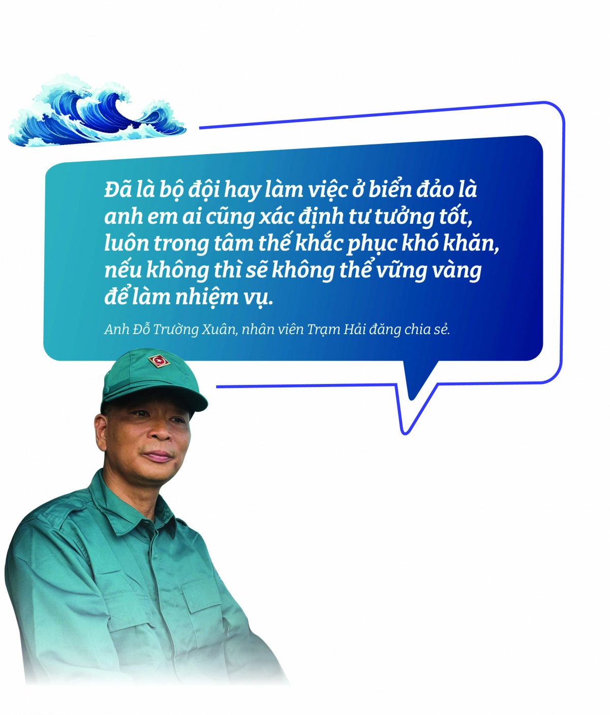 Ở Trường Sa, ngoài hải đăng Đá Lát, Tiên Nữ cũng là trạm vất vả. Do đặc thù dẫn đường, các trạm hải đăng thường nằm ở những vùng xa xôi hẻo lánh đầu luồng đầu lạch, nếu ở đất liền thì cũng nằm ở những mũi nhô ra biển. Ở Tiên Nữ, từ trạm hải đăng sang nơi bộ đội đóng quân là khoảng cách 5 cây số. Ở Đá Lát thì gần đảo hơn, chỉ vài trăm mét nhưng gần đấy mà cũng xa vì mỗi bộ phận mỗi việc, chỉ khi có việc chung mới gặp nhau. Tết đến anh em đi xuồng sang đón năm mới với đơn vị chốc lát rồi lại trở về “tổ chim nhỏ”. Quanh năm suốt tháng ở biển, mỗi lần về đất liền với anh Đỗ Trường Xuân là một lần lạ lẫm, là một lần làm quen lại với mọi thứ. Mỗi lần về lại thấy con lớn lên, khác trước. Lần đầu anh ra đảo con trai đầu mới đẻ, rồi cao dần đến gối, đến hông, đến ngực bố… Và cũng như nhiều người đàn ông khác, nhìn bố mẹ, vợ con vất vả, tủi thân, lo toan mọi việc mỗi dịp lễ Tết, anh Xuân không khỏi chạnh lòng. Nhìn những thiệt thòi ấy của hậu phương, anh vẫn chấp nhận để vượt qua. - "Đã là bộ đội hay làm việc ở biển đảo là anh em ai cũng xác định tư tưởng tốt, luôn trong tâm thế khắc phục khó khăn, nếu không thì sẽ không thể vững vàng để làm nhiệm vụ", anh Xuân bảo tôi.