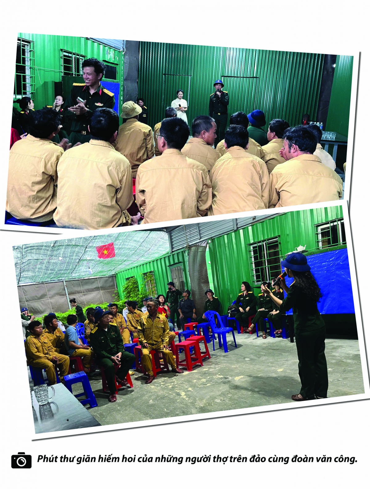 | Những công nhân làm việc tại Tốc Tan A đa phần quê ở dải đất miền Trung, các tỉnh Nghệ An, Quảng Ngãi, Quảng Bình, Quảng Trị, là những người bơi lặn giỏi, có kinh nghiệm làm việc với sóng gió. Dù đảm nhiệm vai trò gì thì họ cũng luôn sẵn sàng. Trần Đình Hoán là công nhân của Công ty Thành An - Binh đoàn 11, đang ngồi nhặt ôm rau mồng tơi để chuẩn bị bữa trưa cho anh em trong đội xây dựng. Trong điều kiện biển đảo, anh em trong đội tự phân công nhau nấu nướng chứ cũng chẳng có người phục vụ. Thời tiết thất thường ở đảo khiến cho các nghệ sĩ của Đoàn Văn công Quân khu 2 phải dời sân khấu cơ động đến 3 lần, tiếng hát tiếng nhạc sôi động vọng khắp đảo như một lời thúc giục khiến Hoán có phần chộn rộn theo. Tôi hỏi Hoán: - Sao không ra xem văn công một lúc rồi về làm? Hoán cười bẽn lẽn: - Cũng muốn lắm nhưng như vậy thì sẽ không kịp cơm để anh em ăn trưa. |