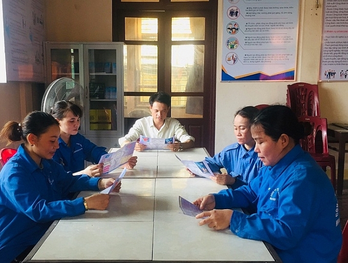 | Công nhân lao động Công ty TNHH Phương Thảo (Quảng Trị) tìm hiểu các thông tin về an toàn, vệ sinh lao động tại "Góc Bảo hộ lao động" của Công ty. Ảnh: LĐLĐ Quảng Trị. |