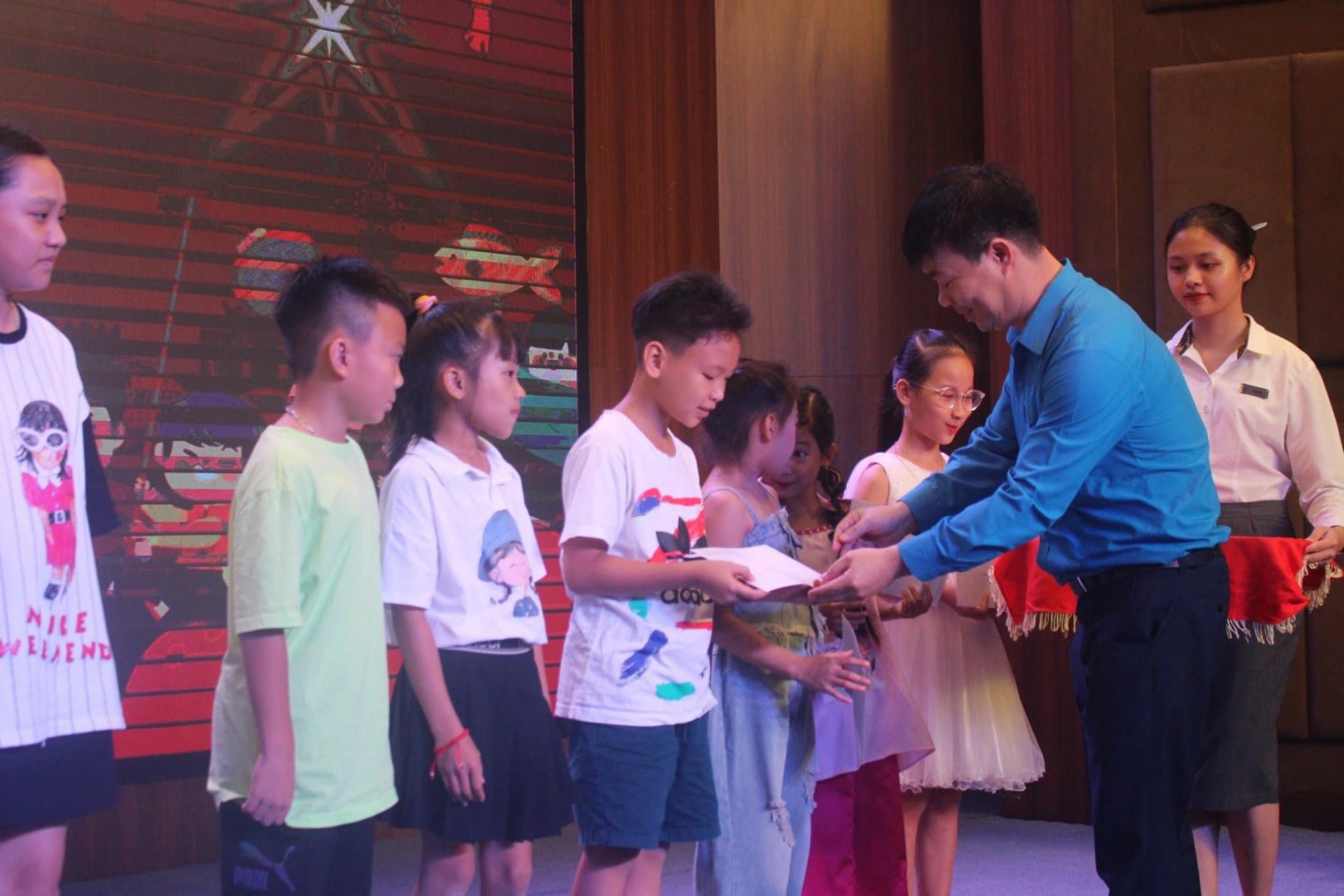 Đồng chí Lương Chí Công, Phó Chủ tịch LĐLĐ tỉnh Lạng Sơn tặng quà cho trẻ em con ĐV, NLĐ đang làm việc tại Khách sạn Mường Thanh Luxury Lạng Sơn. Ảnh: ĐVCC.