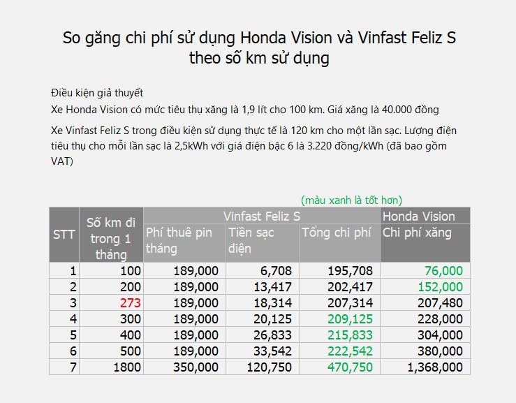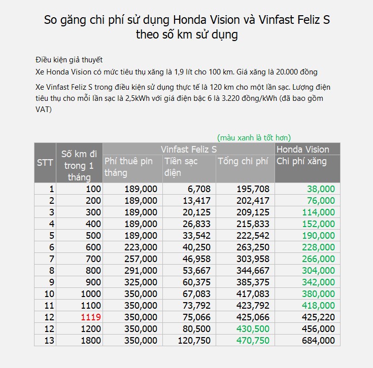 Chạy dưới 1.119 km/tháng thì chạy Vision sẽ tiết kiệm hơn.