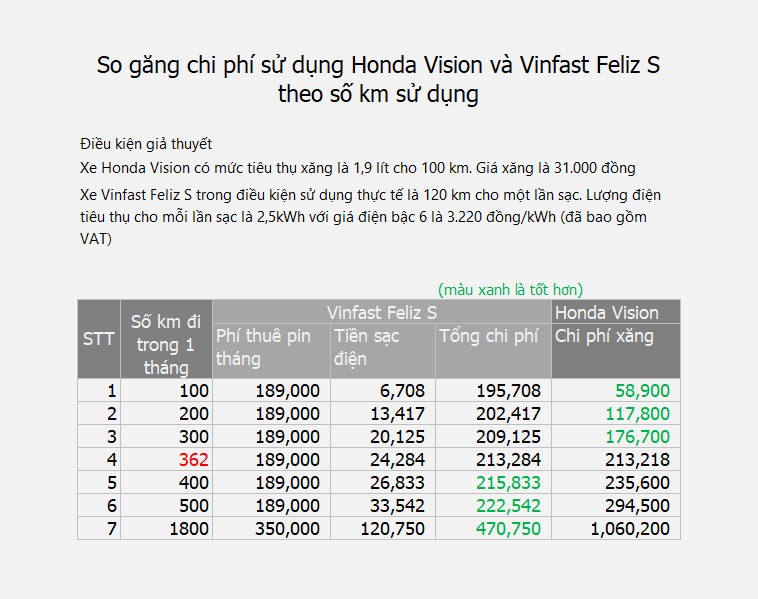 Chạy dưới 362 km/tháng thì chạy Vision sẽ tiết kiệm hơn.