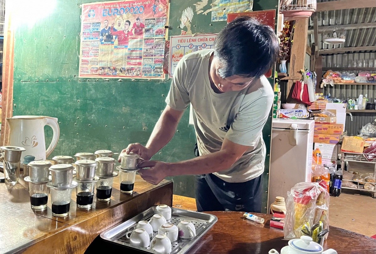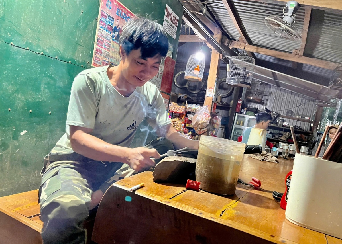 Bà Thơm, mẹ anh Mạnh gầy chõ xôi và bánh bao ra gần lề đường để các công nhân trên đường đi thu mủ dừng lại tiện mua suất ăn sáng. Kỳ lạ thay, đàn gà trong Đội cũng đã dậy kiếm ăn thơ thẩn trong sân dưới ánh điện. Thì ra con người và vạn vật vùng biên này đều quay quanh nhịp điệu của cây cao su, của việc khai thác mủ. Điều lạ thường trong mắt tôi đã trở nên bình thường ở nơi này suốt hàng chục năm qua, kể từ khi những lứa cao su đầu tiên của Binh đoàn 15 bắt đầu cho mủ sau 7 năm trồng. Anh Mạnh làm bảo vệ tại Đội sản xuất số 7, còn vợ anh, chị Phạm Thị Thương làm công nhân. Vợ ra lô cạo mủ, chồng dọn hàng vì công việc bảo vệ của anh chưa cần có mặt. Dọn hàng xong Mạnh nhanh tay đổ cà phê ra đầy các phin và chế nước sôi sẵn để công nhân thu mủ về có cái dùng, sau đó anh lục cục lôi ra một khúc gỗ, chiếc giũa và ca nước bày lên bàn.