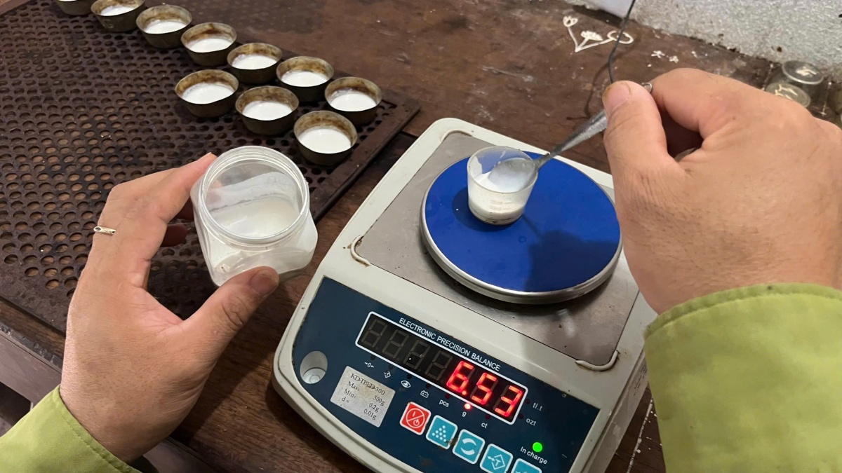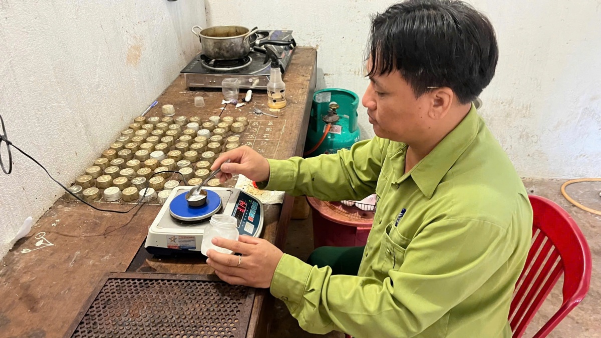 Anh Vượng giải thích, mỗi lô sẽ được lấy mẫu với một mã số riêng, số mủ mẫu này lại được lấy ra một định lượng thống nhất để cô đặc lại theo cách thủ công "chiên" khô trên bếp ga hoặc cũng có thể cho cả loạt vào lò vi sóng. Chất rắn thu được sau cô đặc sẽ lại được đặt lên cân tiểu li để ghi nhận trọng lượng. Mẫu này gọi là TSC, bao gồm cả tạp chất, loại bỏ tạp chất mới là định lượng mủ cao su, được viết tắt là DRC. Đây sẽ là căn cứ để đánh giá hàm lượng mủ nhập về từ các lô. |