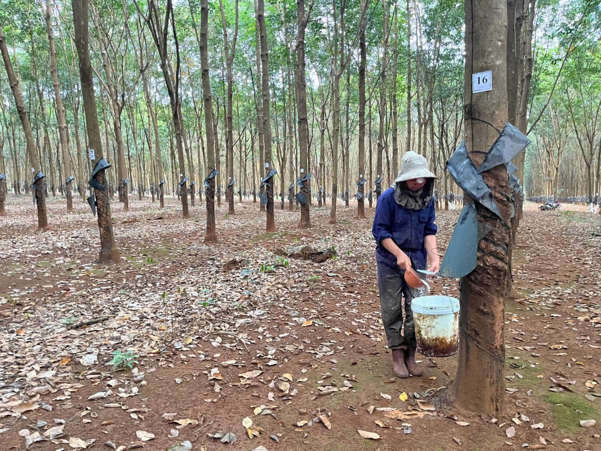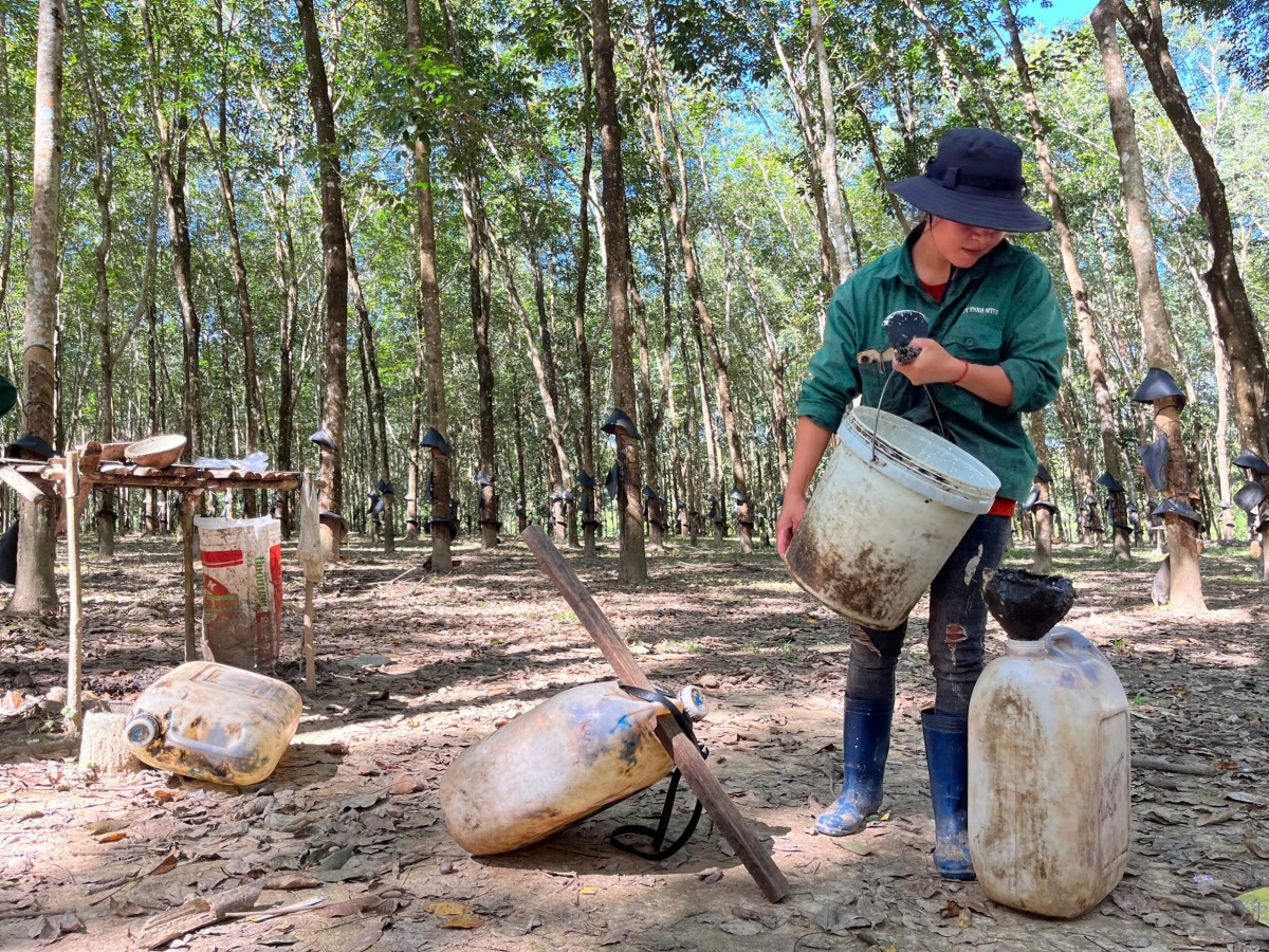 Nữ công nhân Y Đẻ, người Rơ Măm tại xã Mo Ray, huyện Sa Thầy, tỉnh Kon Tum tại lô cao su mà cô phụ trách.