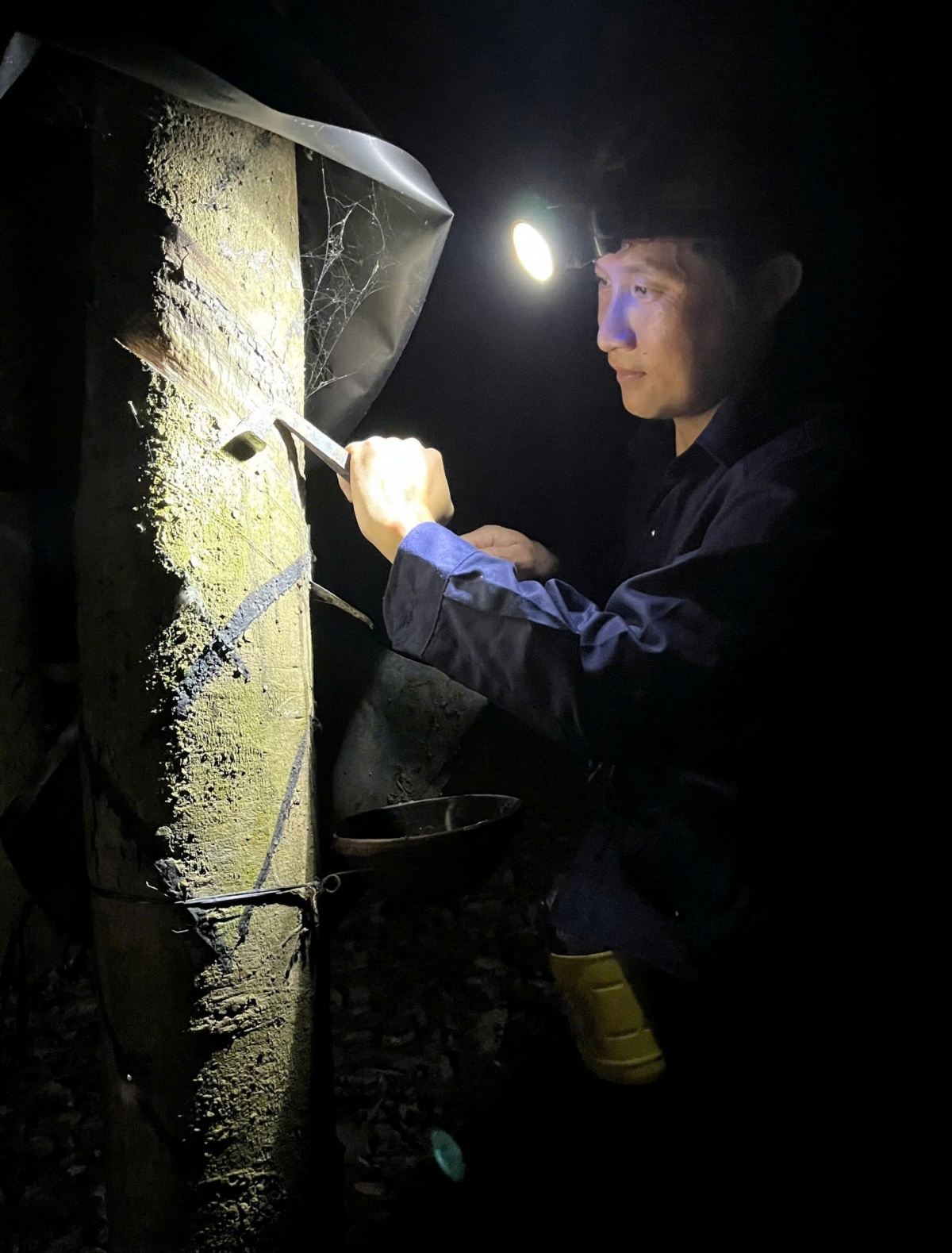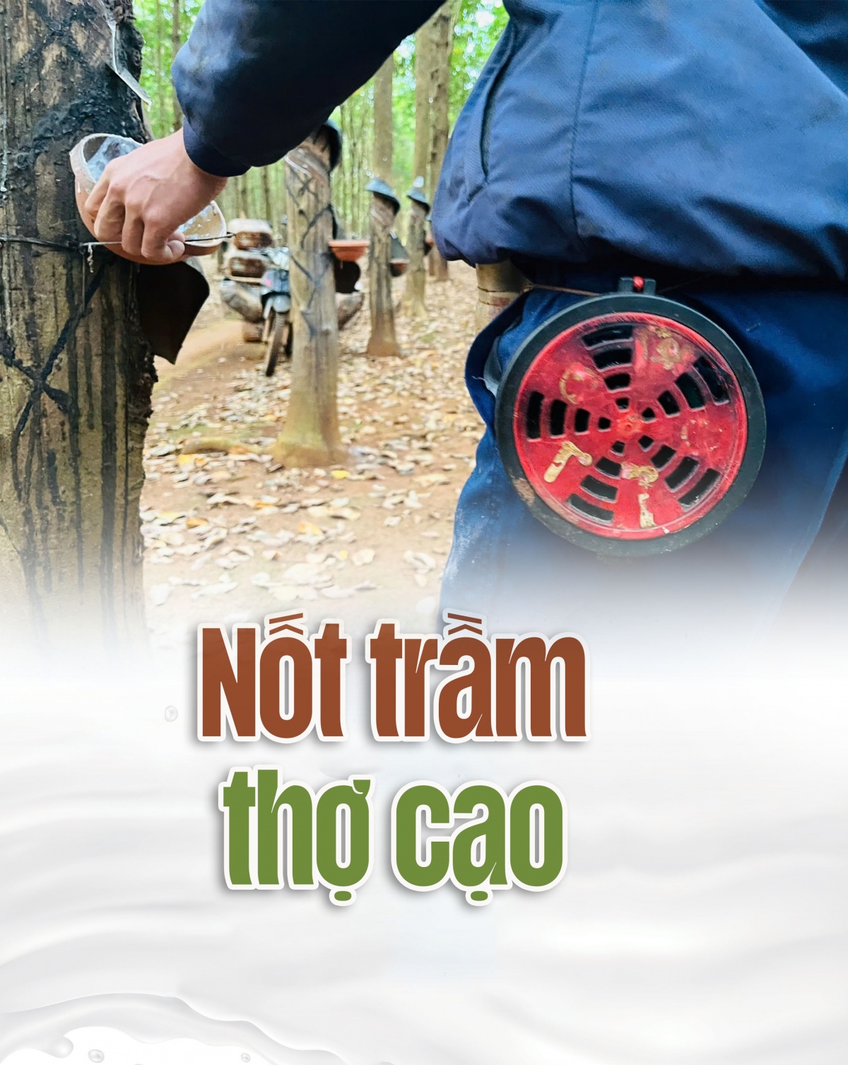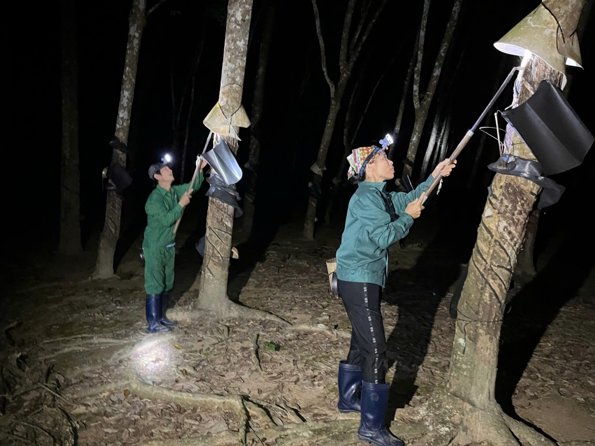 Toàn Chi nhánh 716 có 10 điểm trường mầm non như điểm trường tại Đội sản xuất số 7. Các đơn vị khác thuộc Binh đoàn 15, số điểm trường cũng tương đương như vậy. Được “hoa tiêu” trước nên tôi đã mai phục để theo chân Vi Văn Mưu ra lô cạo mủ. Chờ lúc Mưu phóng xe đến, dựng chiếc xe máy ở hành lang bờ lô, tôi mới lại gần cùng anh và Đội trưởng Kiều Bá Oanh tiến vào rừng cao su. Dù trong đêm, từng động tác của Mưu thoăn thoắt, đầu tiên là bóc mủ dây bám trên đường cạo, lột mủ bám trong lòng bát, “di sản” từ lần cạo trước cho vào chiếc túi vải đeo trước ngực, sau đó Mưu nhanh đóng đưa dao cạo đường cạo mới ngọt lẻm, một dải vỏ cây được lóc ra mỏng như vỏ bào của người thợ mộc nhẹ nhàng buông mình vào đêm không gây ra một tiếng động dù nhỏ. Từ vết cạo, dòng nhựa trắng như sữa chạy theo đường cạo vát 45 độ xuôi xuống máng dẫn mủ rỏ tí tách từng giọt thơm ngậy vào chiếc bát hứng bên dưới.