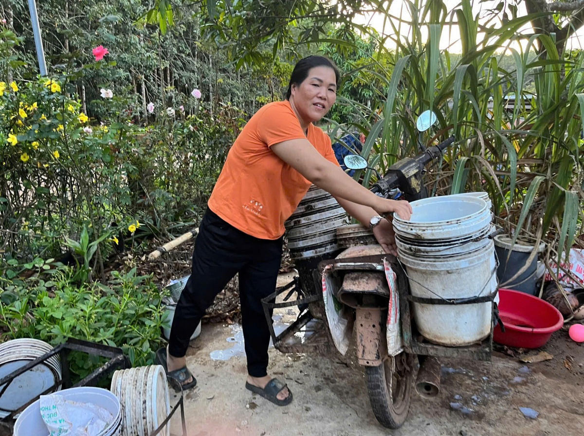 Khác với chị Hương là công nhân có thâm niên, Kha Văn Tiến, quê huyện Kỳ Sơn, Nghệ An là lính mới, vừa đầu quân về Đội 7 năm 2023, tuy vậy anh cũng đã bước đầu quen với công việc. Khi tôi có mặt, số trong xô đang được Tiến rót vào các can nhựa qua một bát lọc để chở về điểm thu gom mủ của Đội. Trong các lô cao su rất nhiều muỗi, trước đây mỗi công nhân thường đốt hương muỗi dạng cây đính vào dao cạo mủ hoặc gắn trên vành mũ để tránh bị muỗi đốt khi làm việc nhiều giờ trong rừng, dần dần việc này đã được chuẩn hoá bằng phụ kiện đeo bên hông đựng hương vòng sử dụng được lâu hơn, tiện lợi và gọn gàng hơn. Như các đồng nghiệp khác, Tiến cũng trang bị cho mình thiết bị đuổi muỗi chuyên dụng. Hèn gì từ lúc vào rừng, do “tay không bắt thợ” tôi đã bị muỗi chích vô số nhát! Trời sáng dần, mủ cao su được các công nhân gom lại chở bằng xe máy, thậm chí là các xe tự chế từ các lô về điểm tập kết. Sau khi nhập cho Đội, những can mủ mới thơm mùi sữa được đổ vào bể chứa. Mủ cao su chở về được vào sổ sau khi cân trọng lượng. Ở căn phòng kế bên, Đại úy Văn Trọng Vượng - Đội phó Đội sản xuất số 7 ngồi trước chiếc cân tiểu li chia từng cốc mủ trắng đặt lên cân, nhìn rất giống đang ngồi… ăn sữa chua.