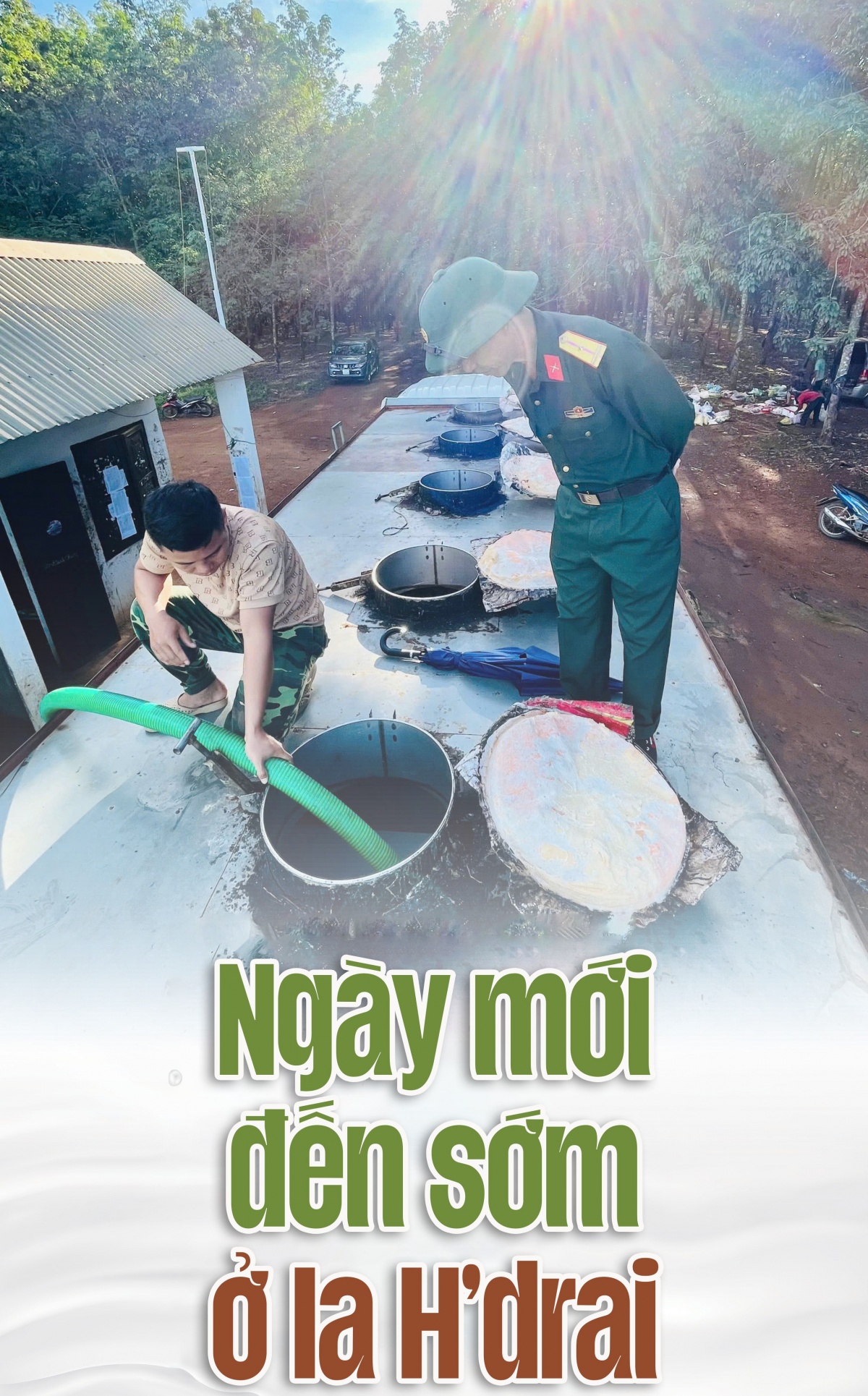 | Có lẽ suốt dải biên giới Việt Nam, trong những nơi tôi có dịp đến, chưa ở đâu ngày mới lại bắt đầu sớm như ở xã Ia Đal, huyện Ia H’Drai, tỉnh Kon Tum. Đây là huyện mới được thành lập năm 2015, tách ra từ xã Mo Rai. 4 giờ 30 sáng, Thiếu tá Kiều Bá Oanh - Đội trưởng Đội sản xuất số 7, Chi nhánh 716 đã dậy đánh kẻng báo giờ đi thu mủ. Chiếc kẻng vốn là vỏ một quả bom từ thời chiến tranh phát ra lảnh lót đánh động vùng biên đang chìm sâu trong giấc ngủ. Từ dãy nhà ở công nhân, trong các căn hộ nhỏ ánh đèn bật sáng như những tín hiệu đáp trả. Khu căng tin đối diện cổng Đội, gia đình anh Bùi Văn Mạnh cũng lục tục dọn hàng, vừa là công nhân của Đội vợ chồng anh vừa kiêm thêm công việc này. Cửa hàng nhà anh dựng trên đất của Đội, đầy đủ các vật dụng cần thiết, nhu yếu phẩm phục vụ công nhân nên cũng hoạt động theo nhịp điệu lao động nơi đây. Bố mẹ anh cũng dậy phụ giúp con.