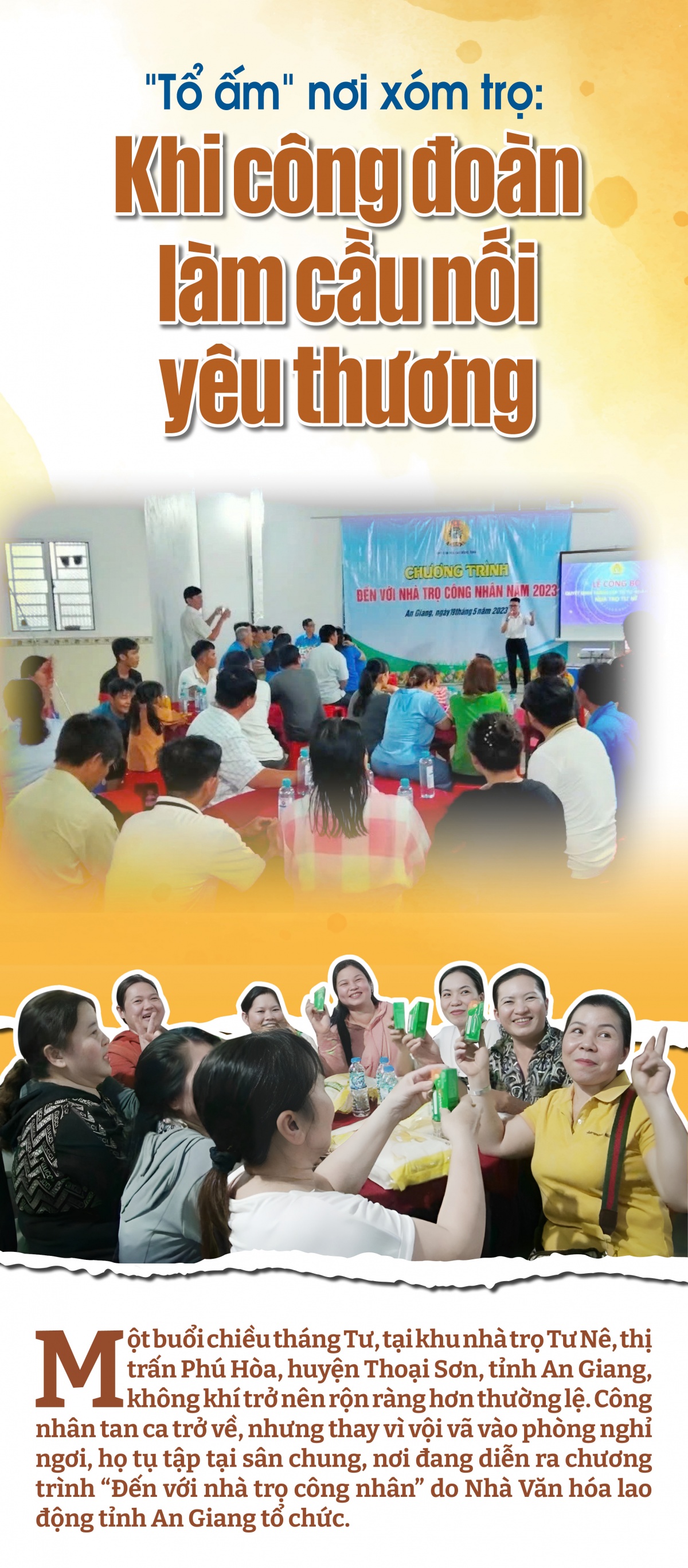 Không có sân khấu, cũng chẳng cần phông bạt, buổi sinh hoạt diễn ra ngay giữa sân trọ – nơi thường ngày là chỗ mọi người phơi đồ, ngồi hóng mát. Tiếng cười nói rộn ràng vang lên khi các phần quà được mang đến, khi mọi người chia nhau từng chai dầu ăn, ký gạo, bịch đường. Trẻ con thì háo hức với những phần quà bố mẹ vừa nhận.