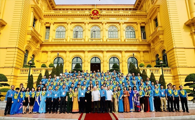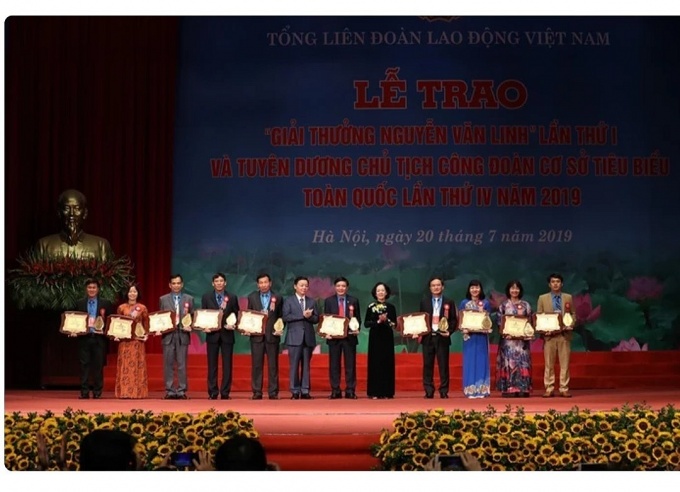 Tổng Bí thư - Chủ tịch nước Nguyễn Phú Trọng (ảnh giữa) chụp ảnh lưu niệm với cán bộ công đoàn được trao tặng Giải thưởng Nguyễn Văn Linh cùng 90 Chủ tịch công đoàn cơ sở tiêu biểu tại Phủ Chủ tịch tháng 7/2019. Ảnh: Hải Nguyễn |