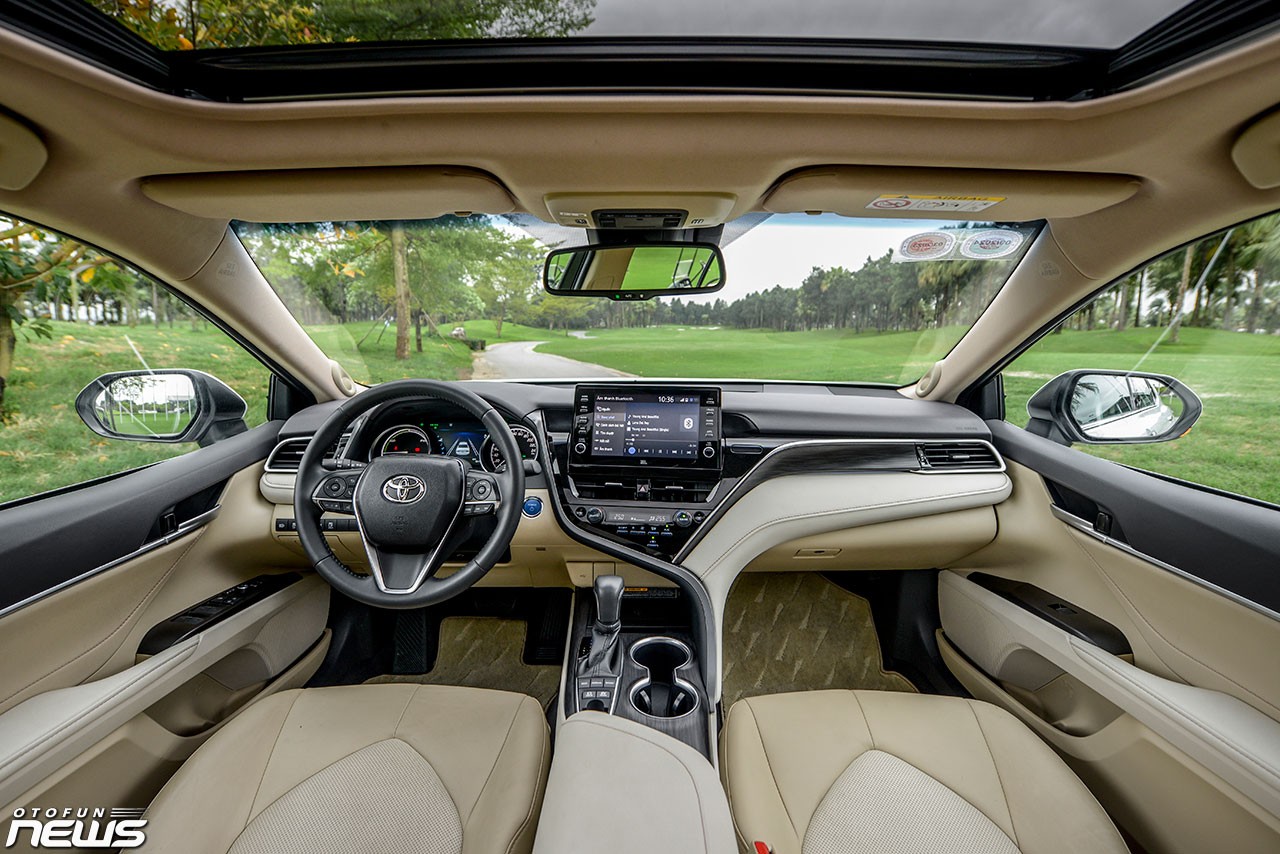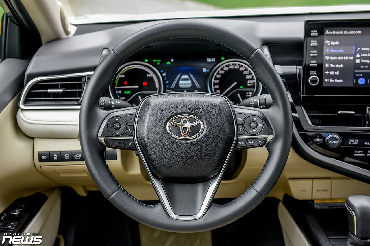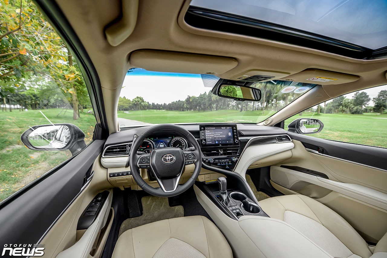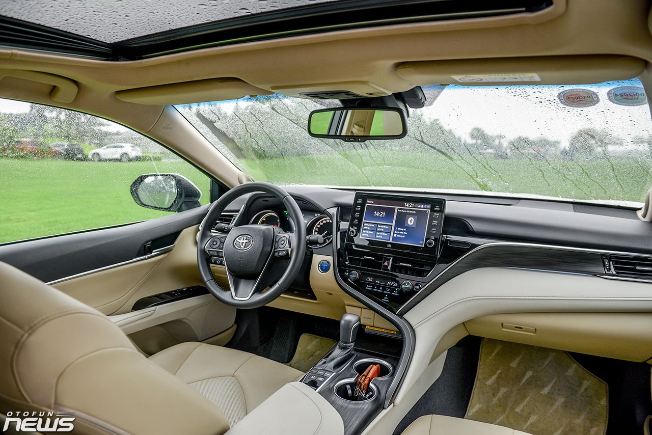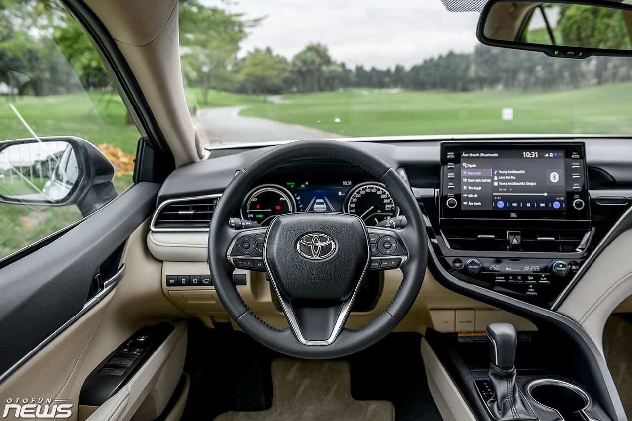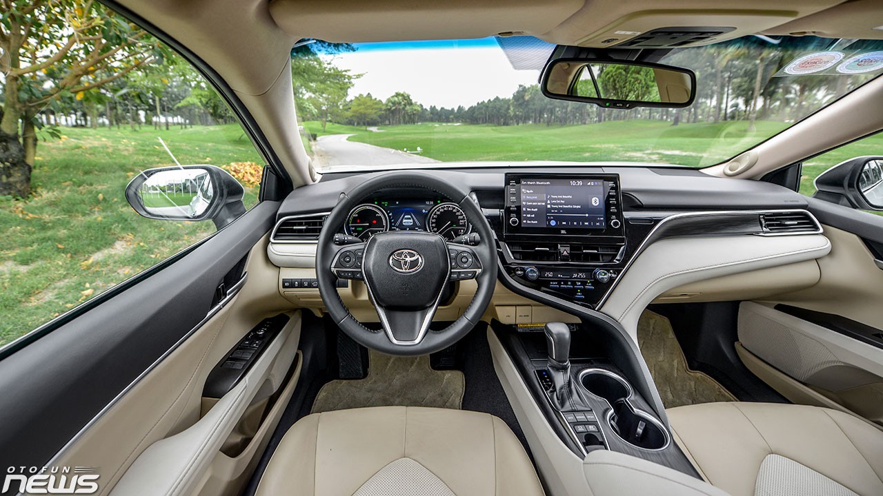 Nội thất Toyota Camry mang đến cảm giác tiện nghi, rộng rãi và sang trọng. Vô-lăng bọc da ba chấu chỉnh điện 4 hướng, tích hợp hàng loạt phím bấm chức năng. Đồng hồ hiển thị dạng analog với đồng hồ tốc độ bên phải và đồng hồ chỉ thị động cơ làm việc kết hợp màn hình hiển thị TFT 7 inch. Hệ thống giải trí sử dụng màn hình cảm ứng 9 inch, hỗ trợ kết nối bluetooth, Apple Car Play và Android Auto. Hệ thống này còn đi kèm dàn âm thanh 9 loa JBL. Một số tính năng đáng chú ý khác có thể kể đến như màn hình hiển thị lên kính lái HUD, cửa sổ trời, phanh tay điện tử, sạc điện thoại không dây chuẩn Qi, camera 360 toàn cảnh. |