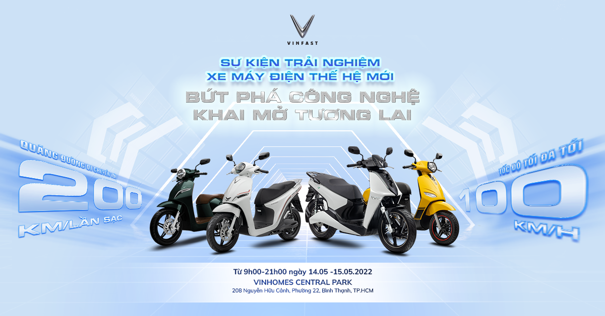 Trong hai ngày 14-15/5, VinFast sẽ tổ chức sự kiện trải nghiệm các dòng xe máy điện thế hệ mới gồm Feliz S, Klara S 2022, Vento S và Theon S tại Vinhomes Central Park (Quận Bình Thạnh, TP.HCM). Các khách hàng yêu thích xe máy điện sẽ có cơ hội lái thử các mẫu xe mới được ứng dụng công nghệ pin LFP, có khả năng di chuyển gần 200km/lần sạc, đồng thời trải nghiệm các hoạt động tương tác và chương trình giải trí đặc sắc tại sự kiện.