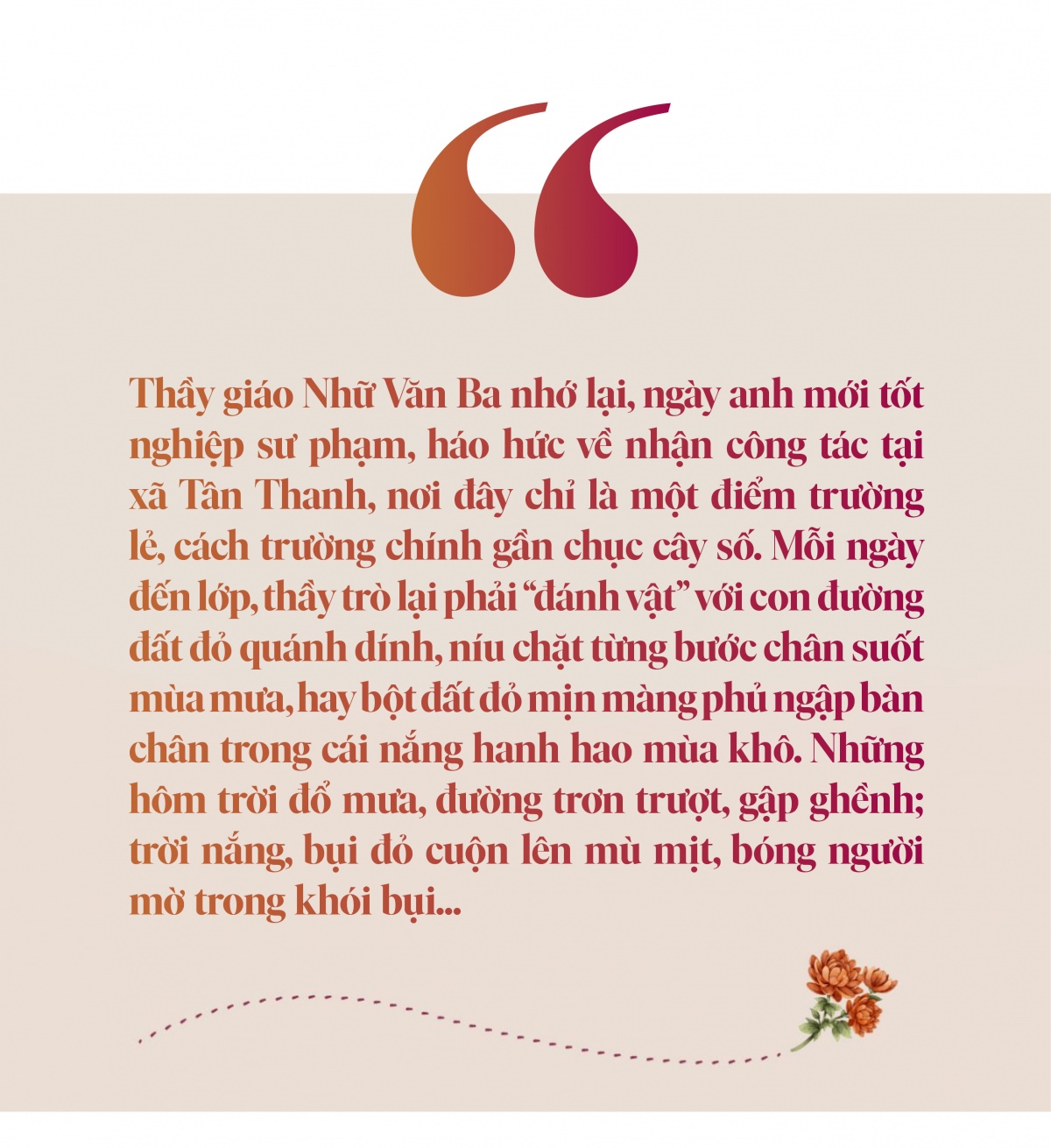 Thầy giáo Nhữ Văn Ba nhớ lại, ngày anh mới tốt nghiệp sư phạm, háo hức về nhận công tác tại xã Tân Thanh, nơi đây chỉ là một điểm trường lẻ, cách trường chính gần chục cây số. Mỗi ngày đến lớp, thầy trò lại phải “đánh vật” với con đường đất đỏ quánh dính, níu chặt từng bước chân suốt mùa mưa, hay bột đất đỏ mịn màng phủ ngập bàn chân trong cái nắng hanh hao mùa khô. Những hôm trời đổ mưa, đường trơn trượt, gập ghềnh; trời nắng, bụi đỏ cuộn lên mù mịt, bóng người mờ trong khói bụi…